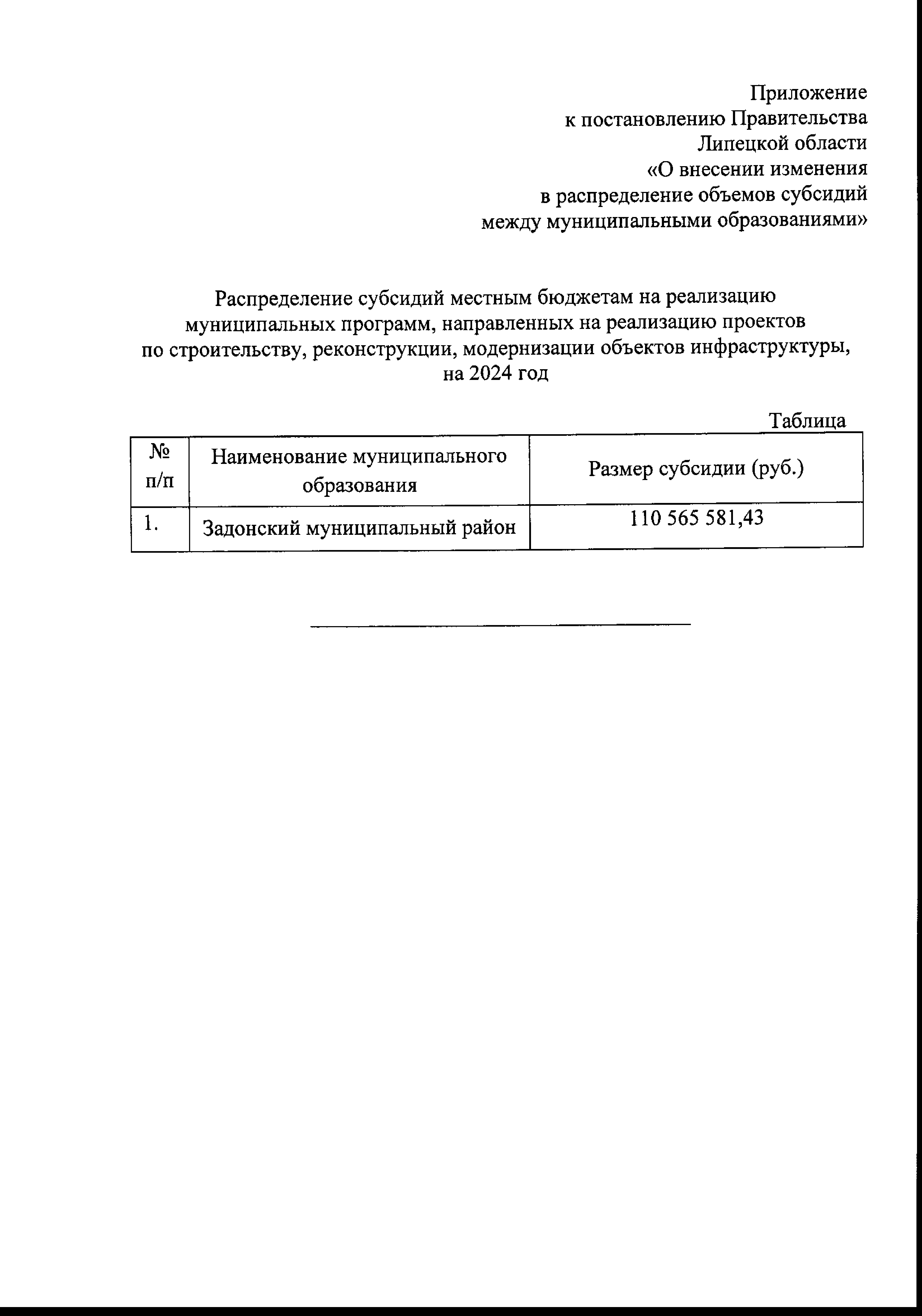"О внесении изменения в распределение объемов субсидий между муниципальными образованиями"