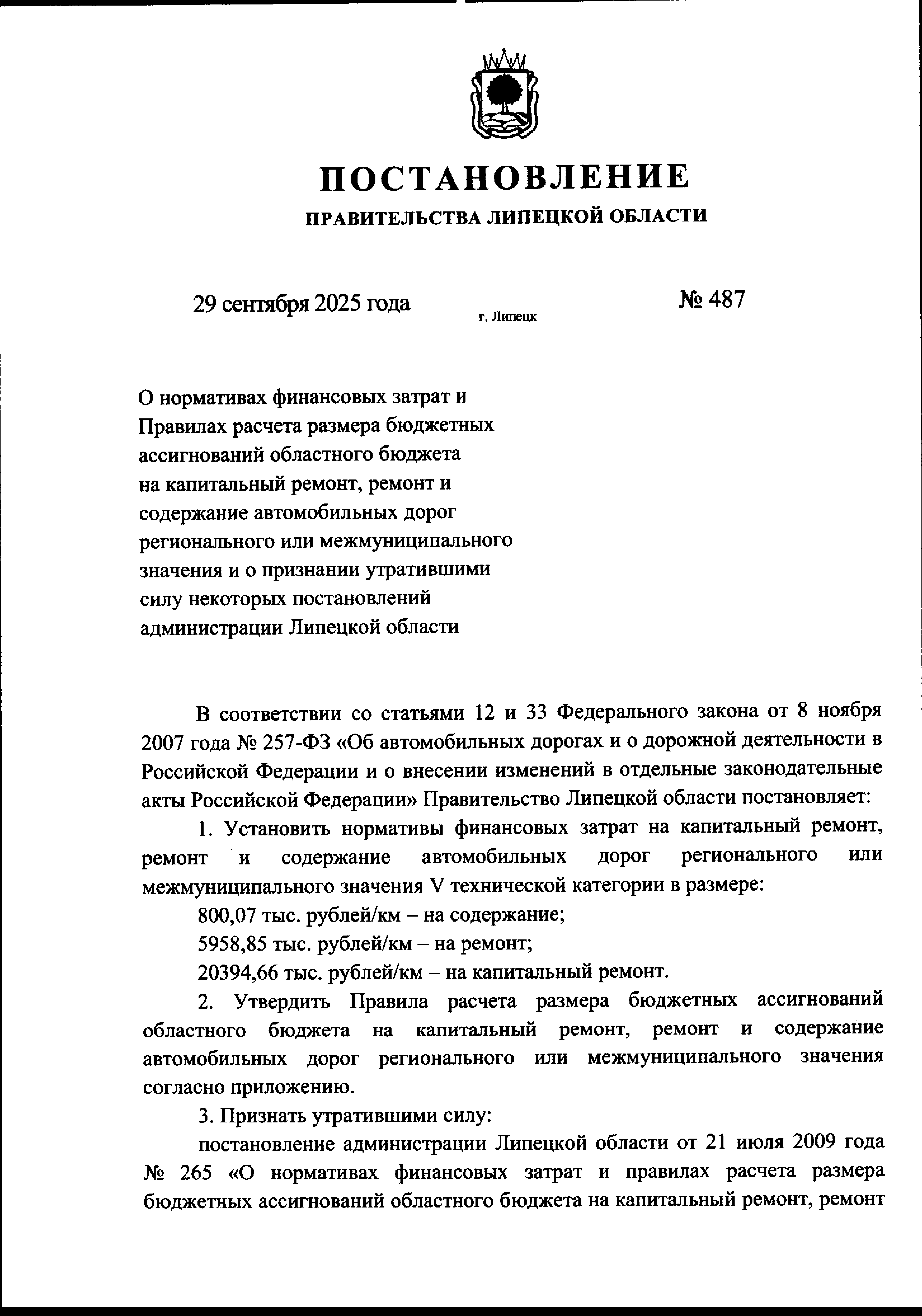 "О нормативах финансовых затрат и Правилах расчета размера бюджетных ассигнований областного бюджета на капитальный ремонт, ремонт и содержание автомобильных дорог регионального или межмуниципального значения и о признании утратившими силу некоторых постановлений администрации Липецкой области"