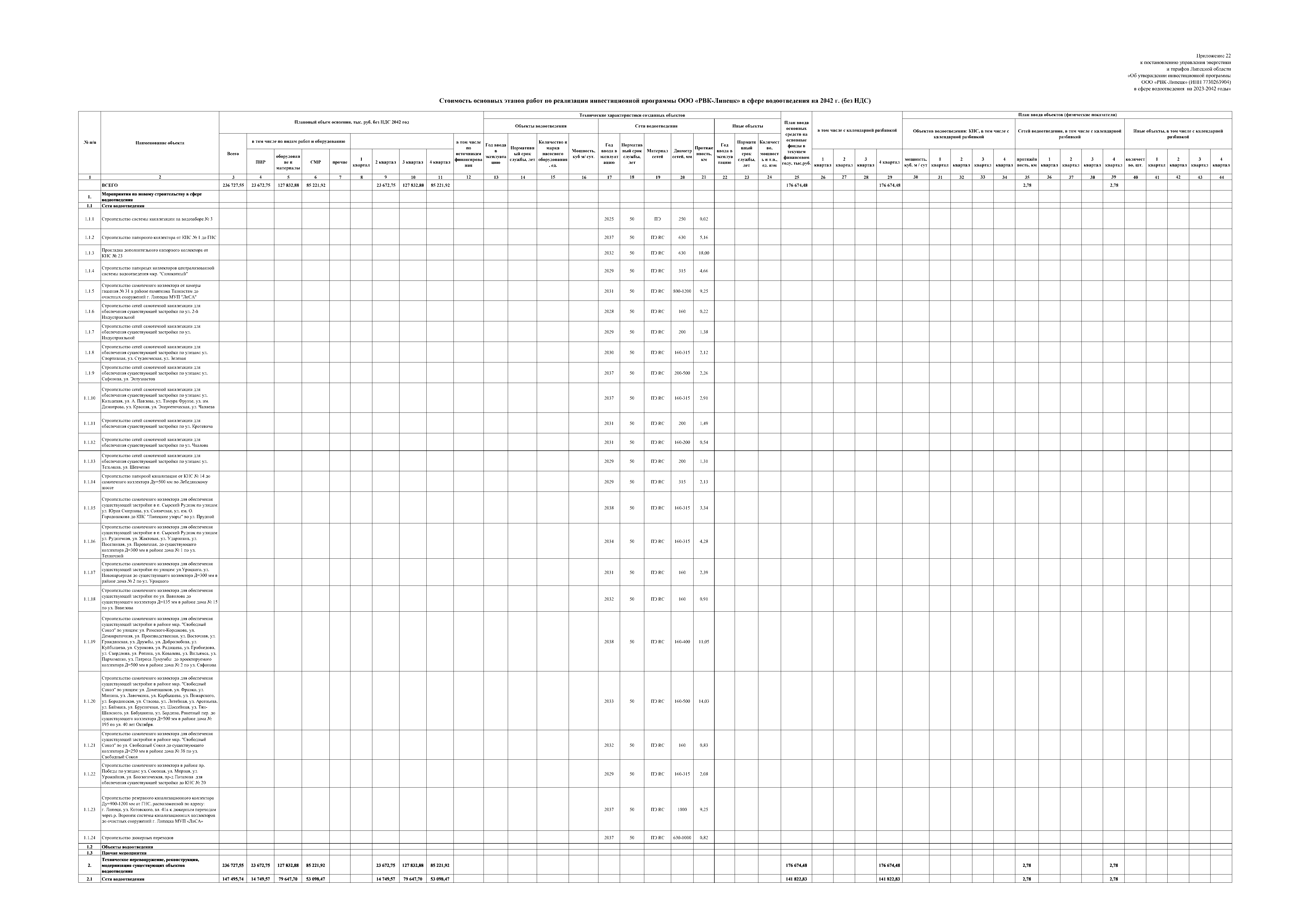 "Об утверждении инвестиционной программы ООО "РВК-Липецк" (ИНН 7730263904) в сфере водоотведения на 2023-2042 годы"