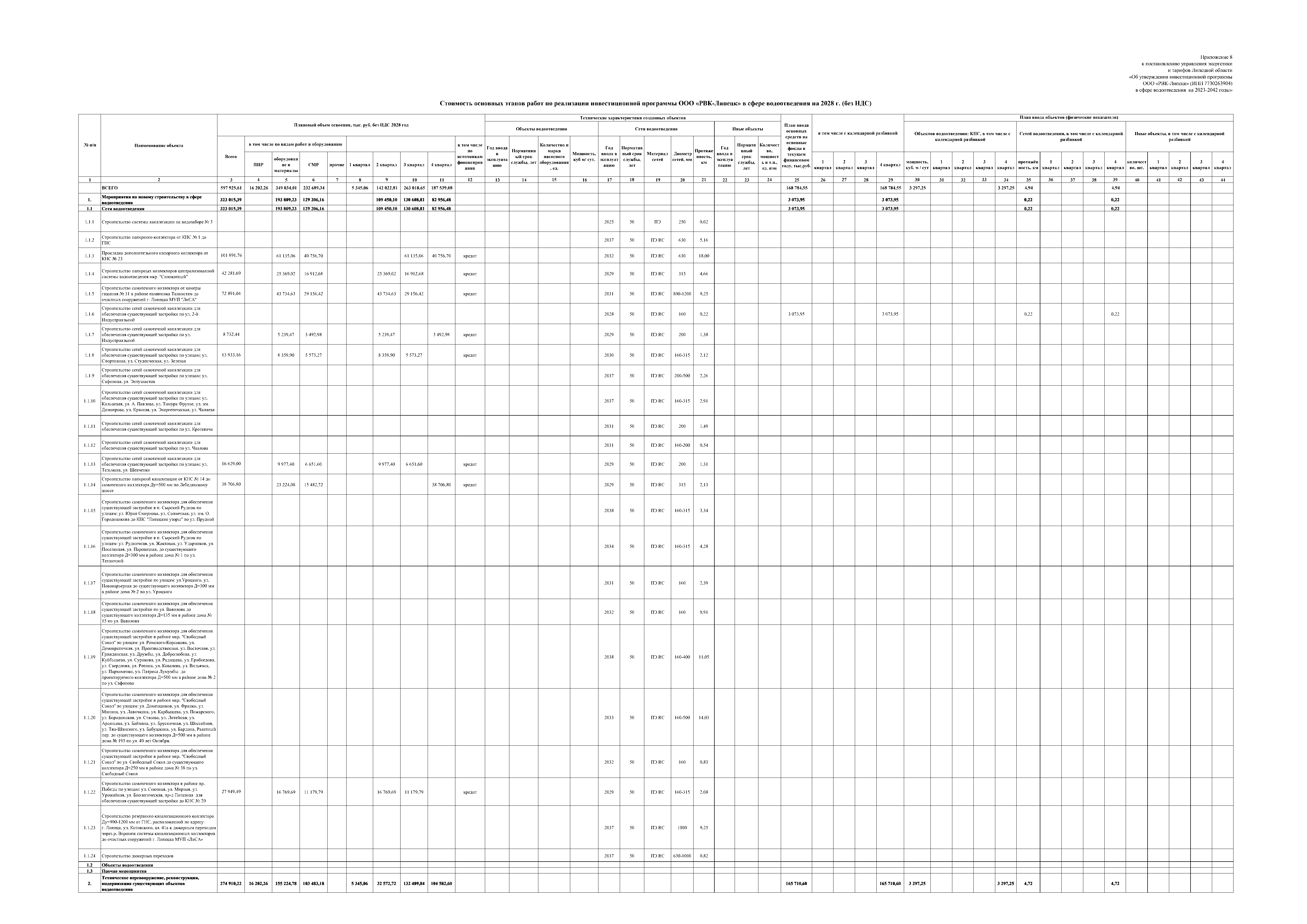 "Об утверждении инвестиционной программы ООО "РВК-Липецк" (ИНН 7730263904) в сфере водоотведения на 2023-2042 годы"