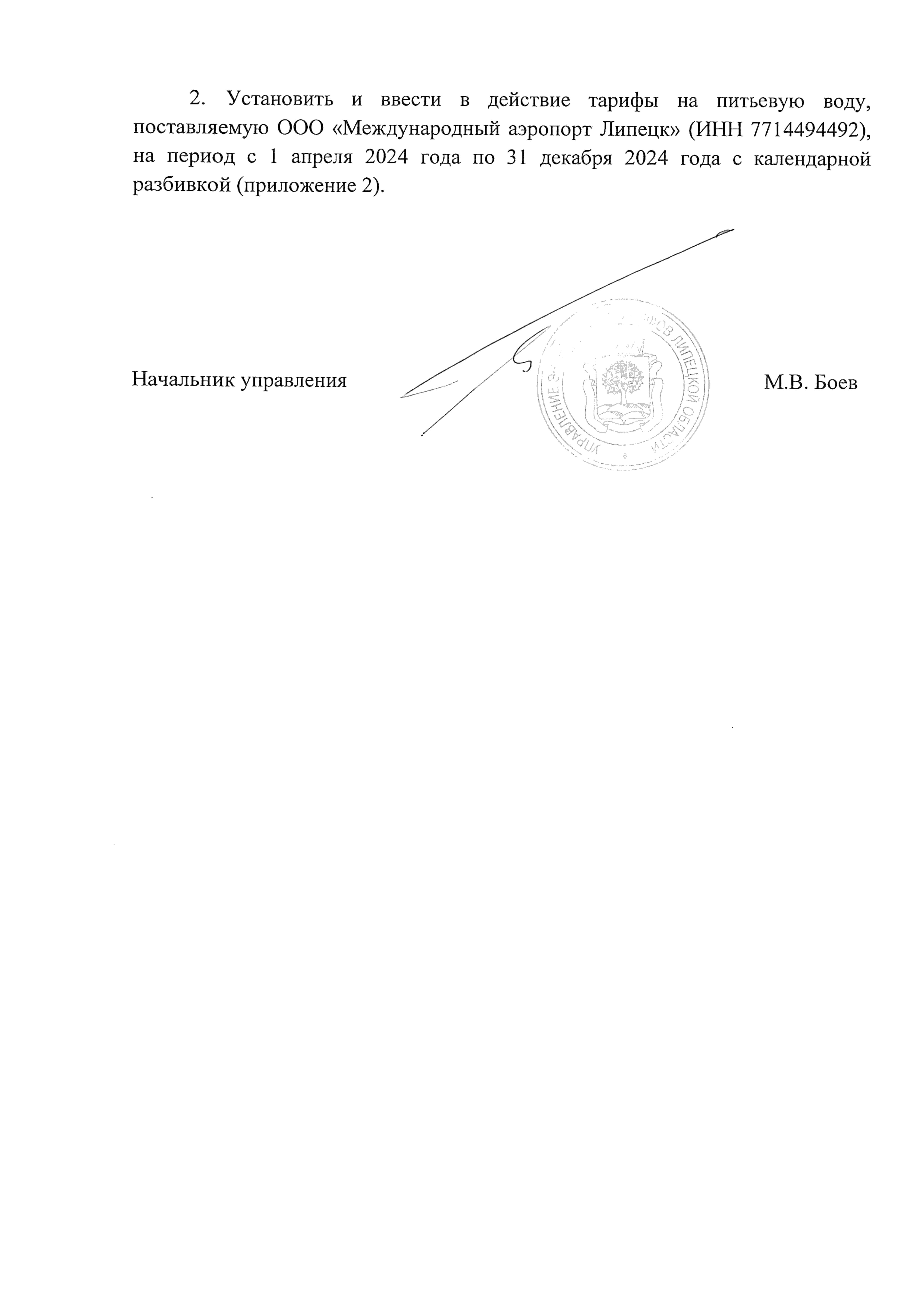"О тарифах на питьевую воду ООО "Международный аэропорт Липецк" (ИНН 7714494492) на период с 1 апреля 2024 года по 31 декабря 2024 года"