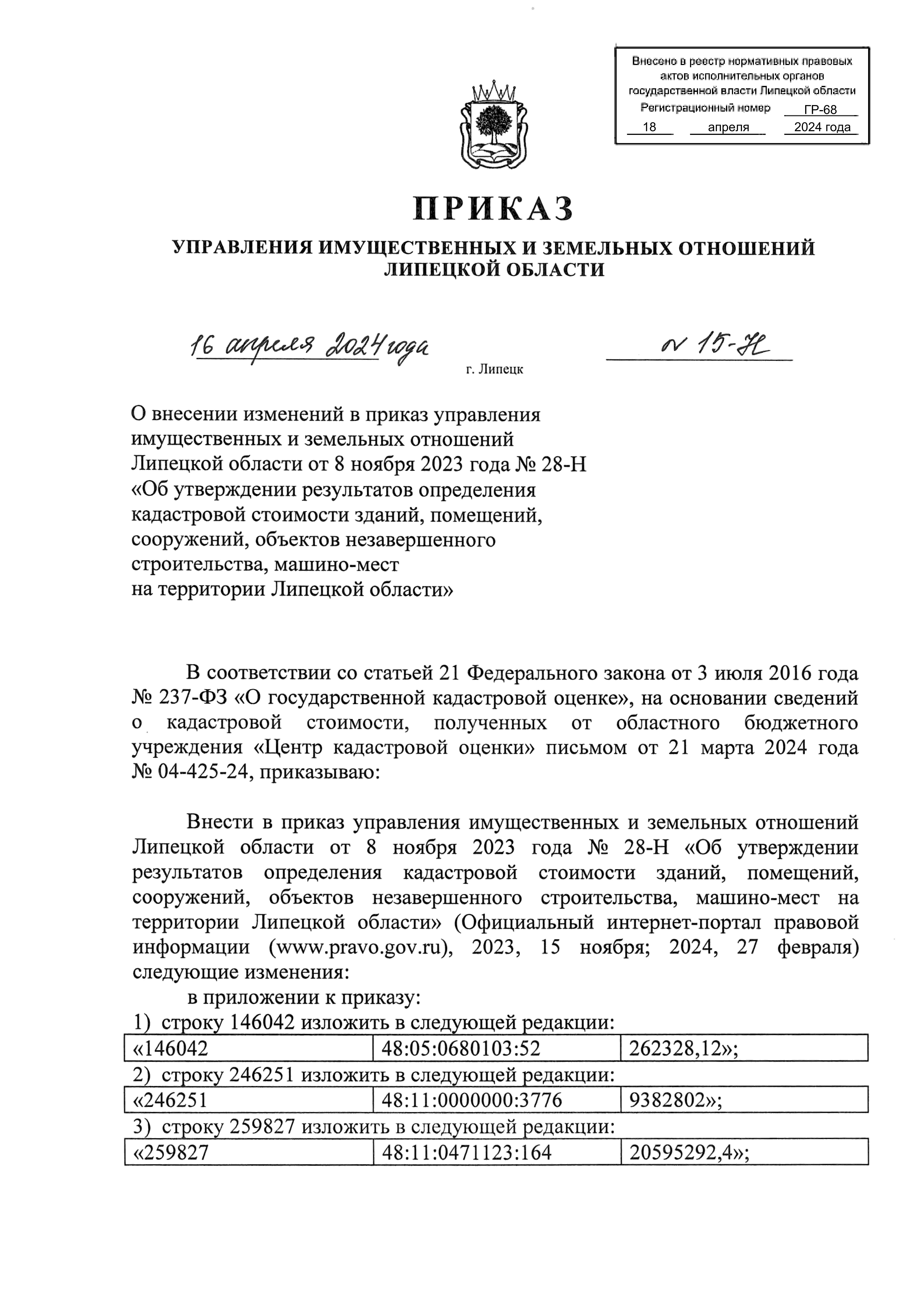 "О внесении изменений в приказ управления имущественных и земельных отношений Липецкой области от 8 ноября 2023 года № 28-Н "Об утверждении результатов определения кадастровой стоимости зданий, помещений, сооружений, объектов незавершенного строительства, машино-мест на территории Липецкой области"