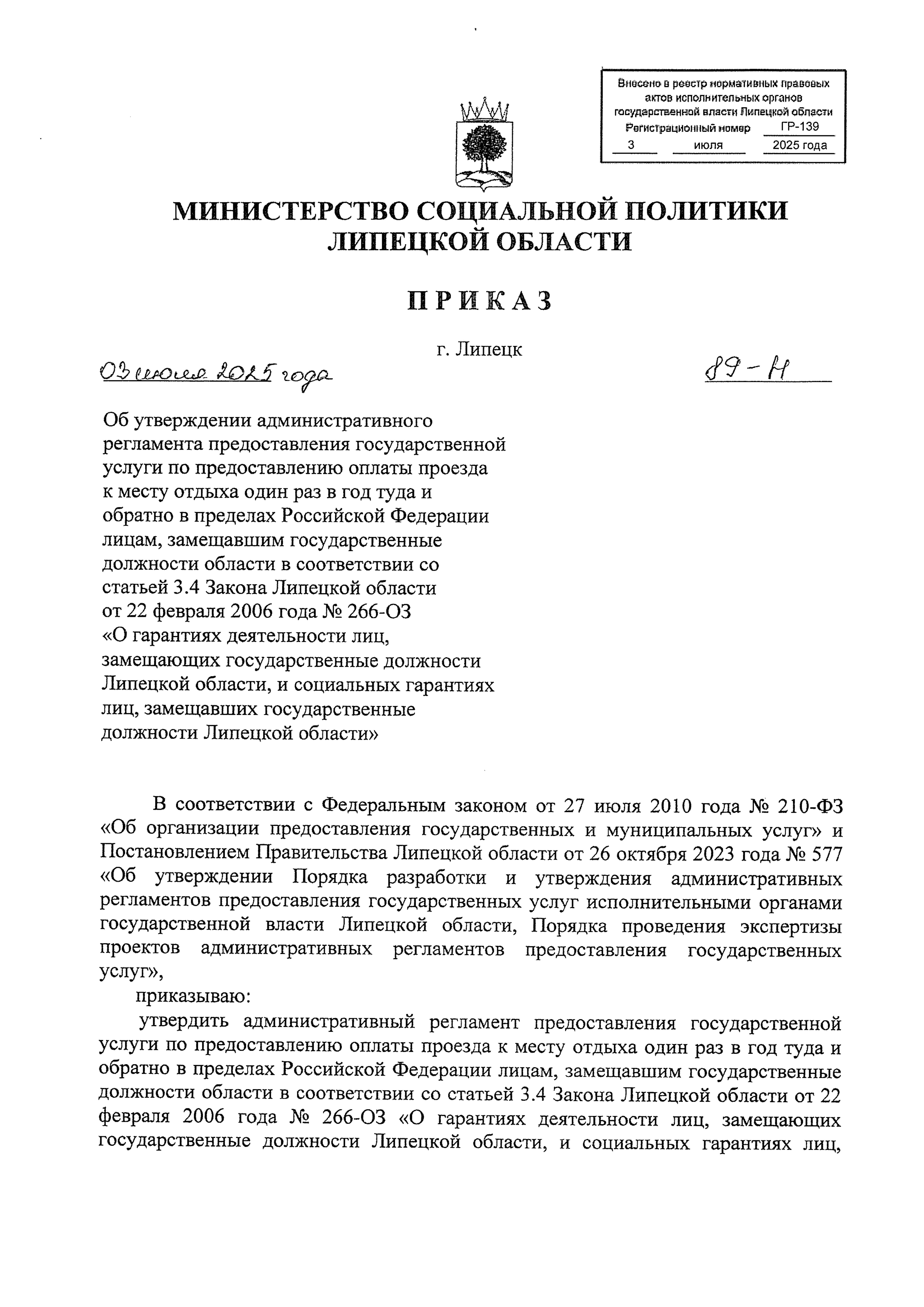 Приказ министерства социальной политики Липецкой области от 03.07.2025 № 89-Н "Об утверждении административного регламента предоставления государственной услуги по предоставлению оплаты проезда к месту отдыха один раз в год туда и обратно в пределах Российской Федерации лицам, замещавшим государственные должности области в соответствии со статьей 3.4 Закона Липецкой области от 22 февраля 2006 года № 266-ОЗ "О гарантиях деятельности лиц, замещающих государственные должности Липецкой области, и социальных гарантиях лиц, замещавших государственные должности Липецкой области"