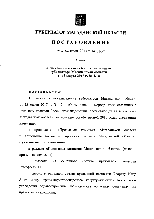 "О внесении изменений в постановление губернатора Магаданской области от 15 марта 2017 г. № 42-п "О выполнении мероприятий, связанных с призывом граждан Российской Федерации, проживающих на территории Магаданской области, на военную службу весной 2017 года"