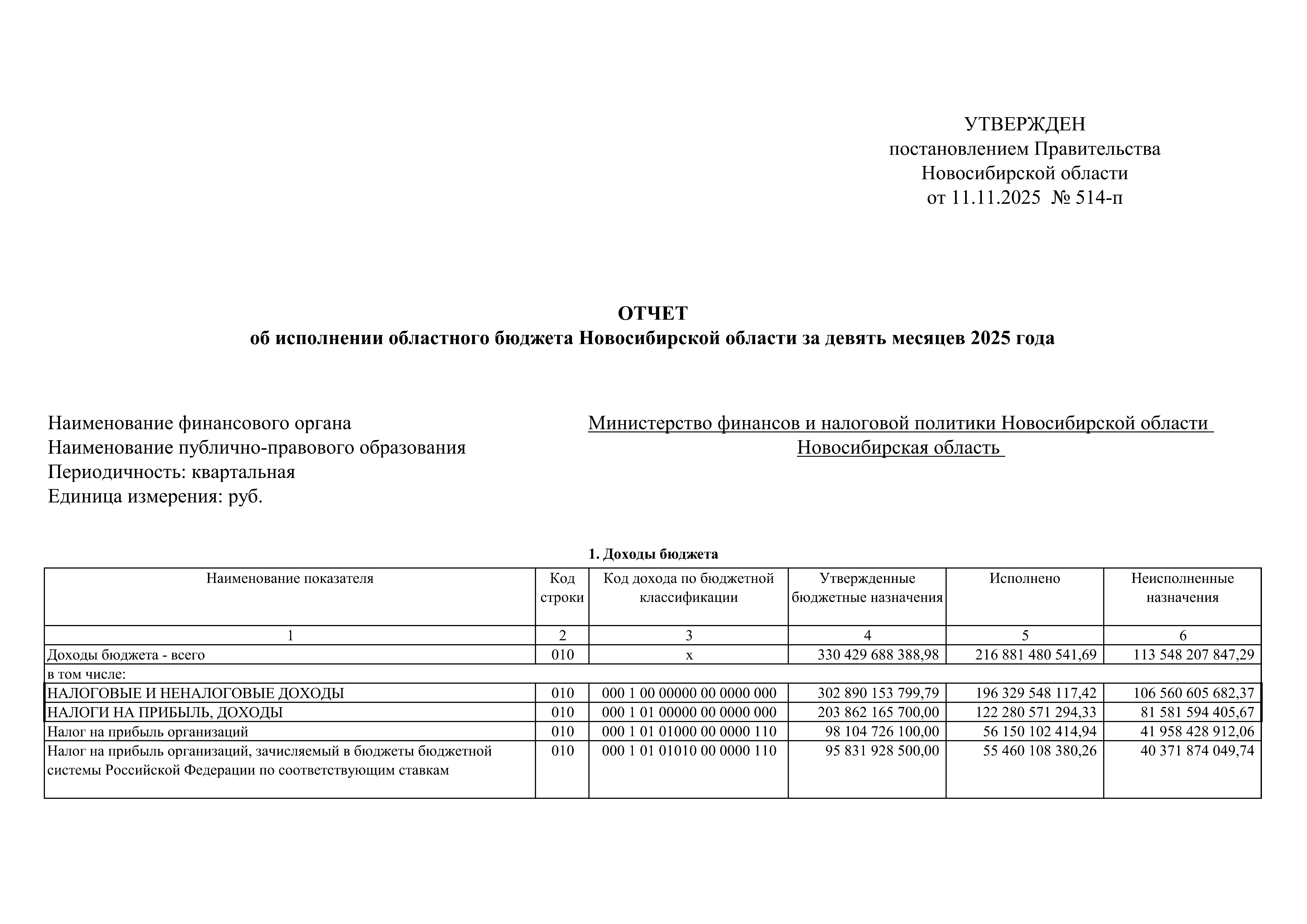 "Об утверждении отчета об исполнении областного бюджета Новосибирской области за девять месяцев 2025 года"