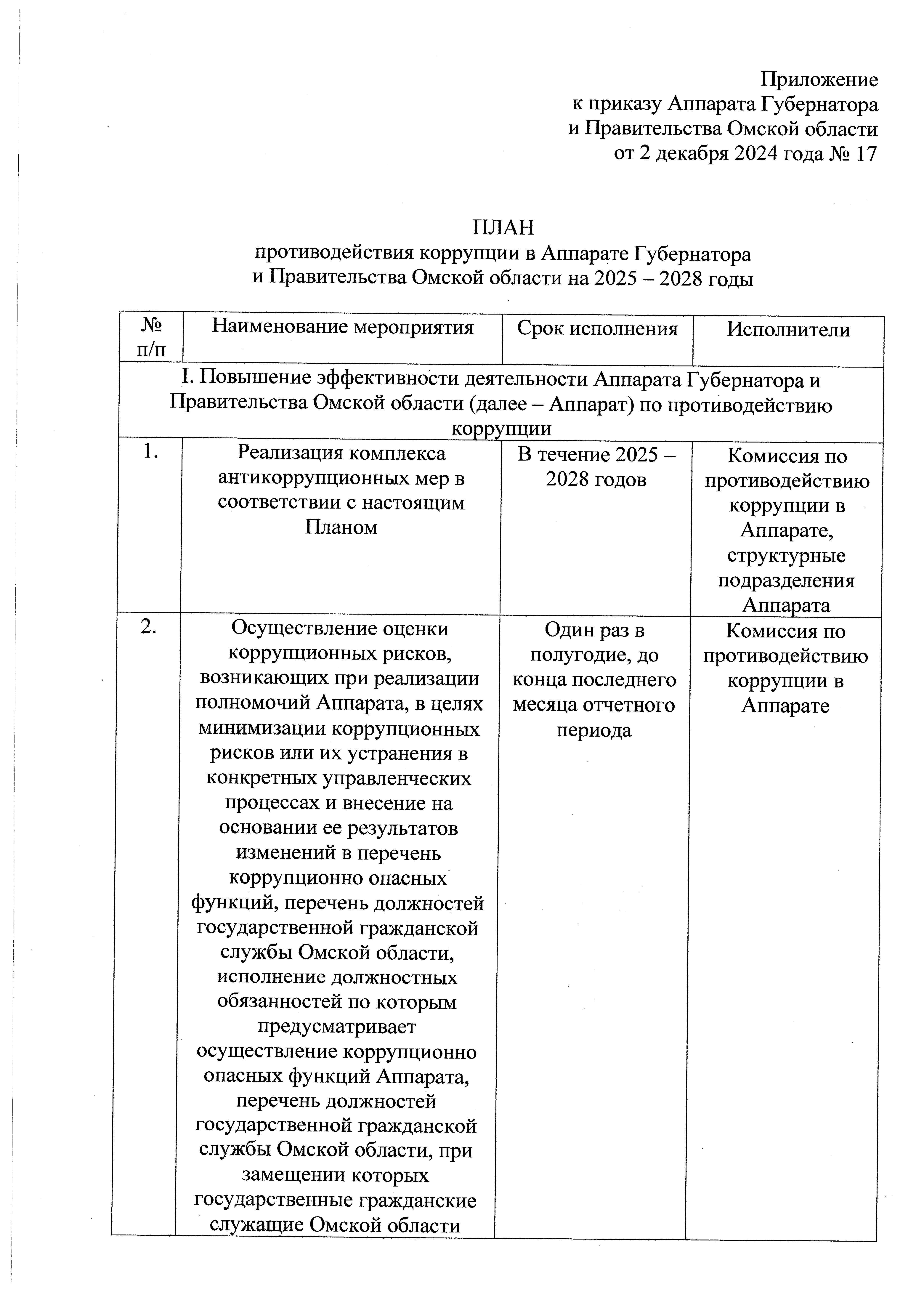 "Об утверждении Плана противодействия коррупции в Аппарате Губернатора и Правительства Омской области на 2025-2028 годы"