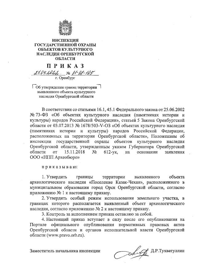 Приказ Инспекции государственной охраны объектов культурного наследия Оренбургской области от 27.04.2022 № 01-08-105