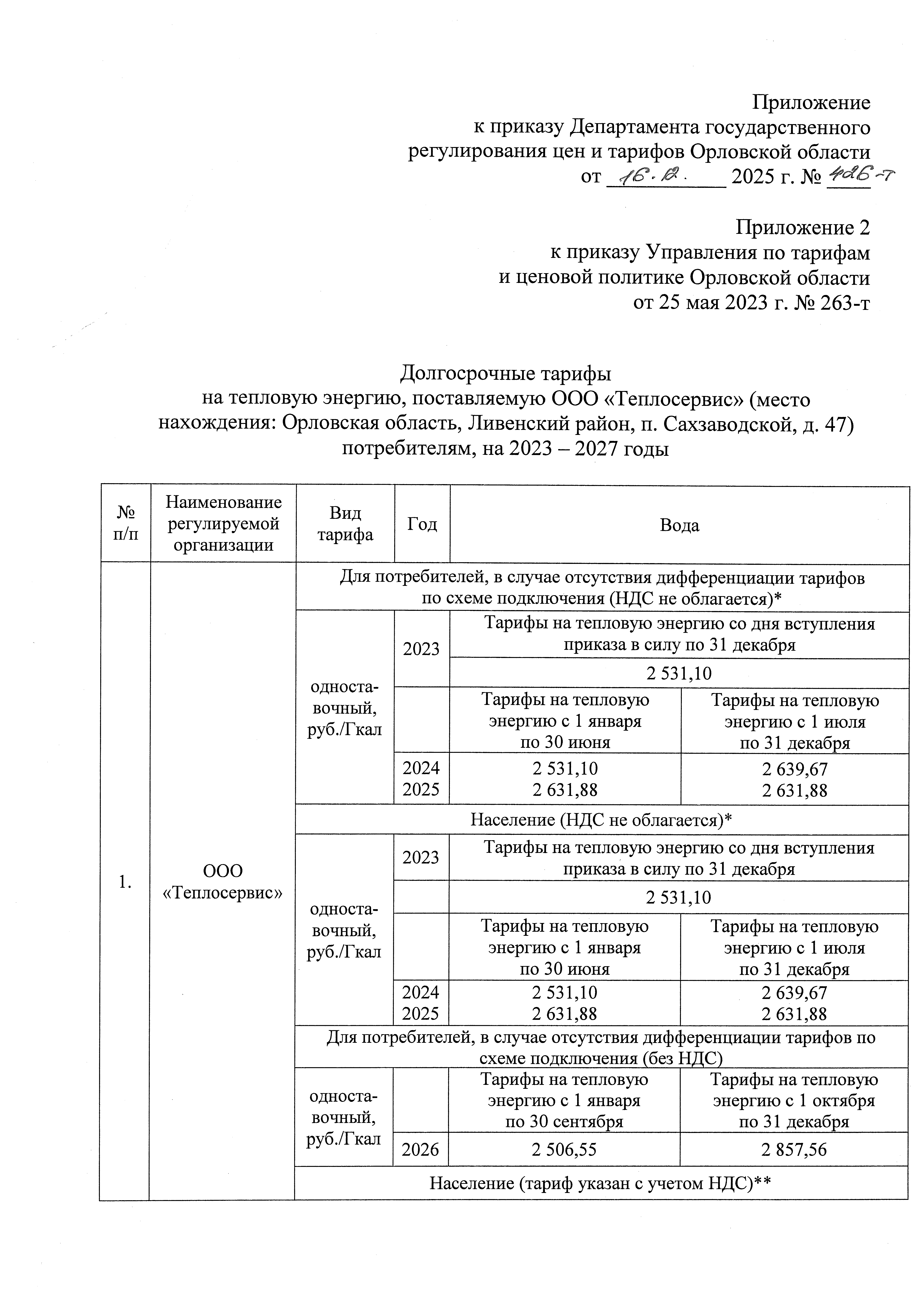 "О внесении изменения в приказ Управления по тарифам и ценовой политике Орловской области от 25 мая 2023 года № 263-т "Об установлении долгосрочных параметров регулирования и долгосрочных тарифов на тепловую энергию, поставляемую ООО "Теплосервис" (место нахождения: Орловская область, Ливенский район, п. Сахзаводской, д. 47) потребителям"