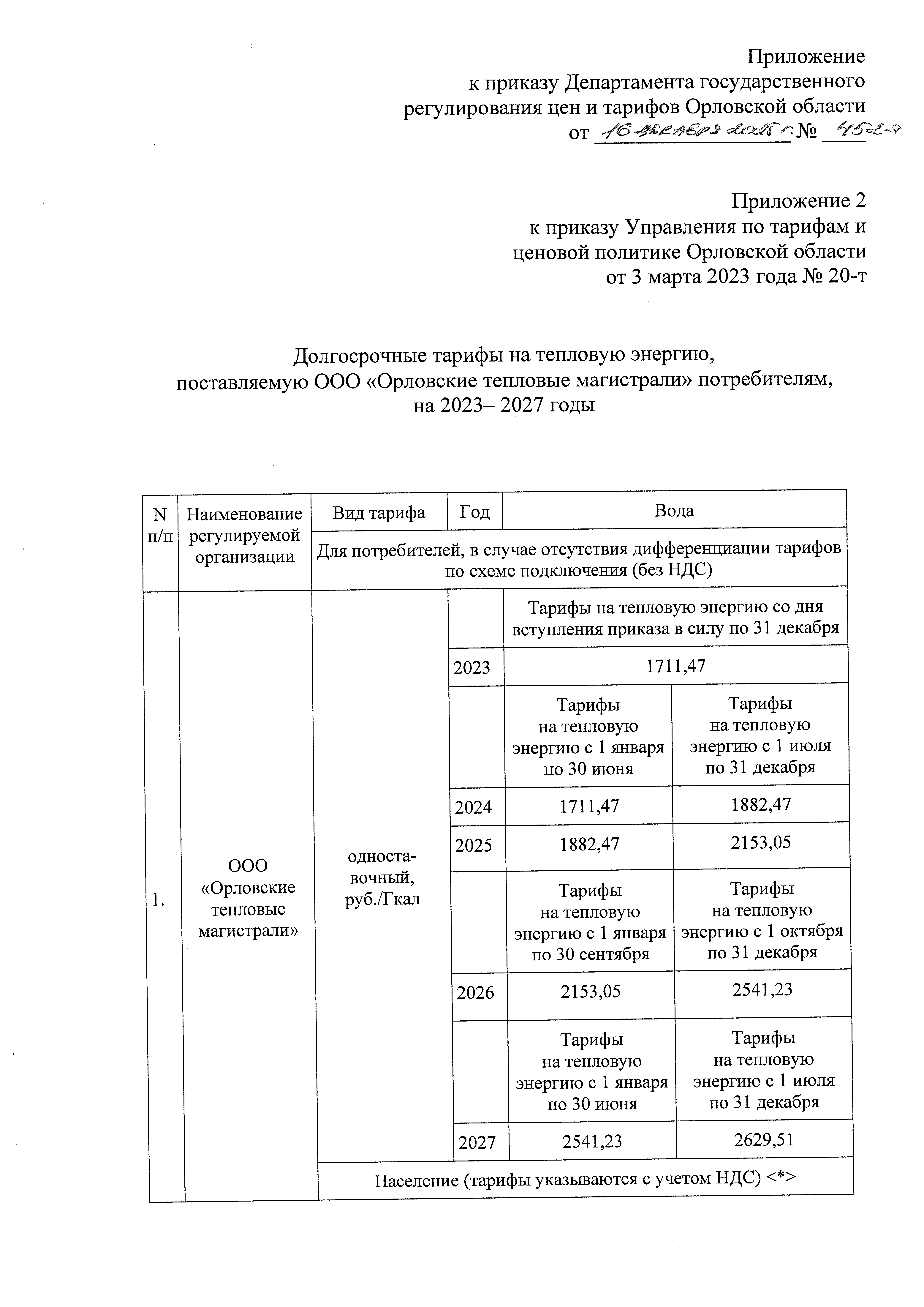 "О внесении изменения в приказ Управления по тарифам и ценовой политике Орловской области от 3 марта 2023 года № 20-т "Об установлении долгосрочных параметров регулирования и долгосрочных тарифов на тепловую энергию, поставляемую ООО "Орловские тепловые магистрали" потребителям"