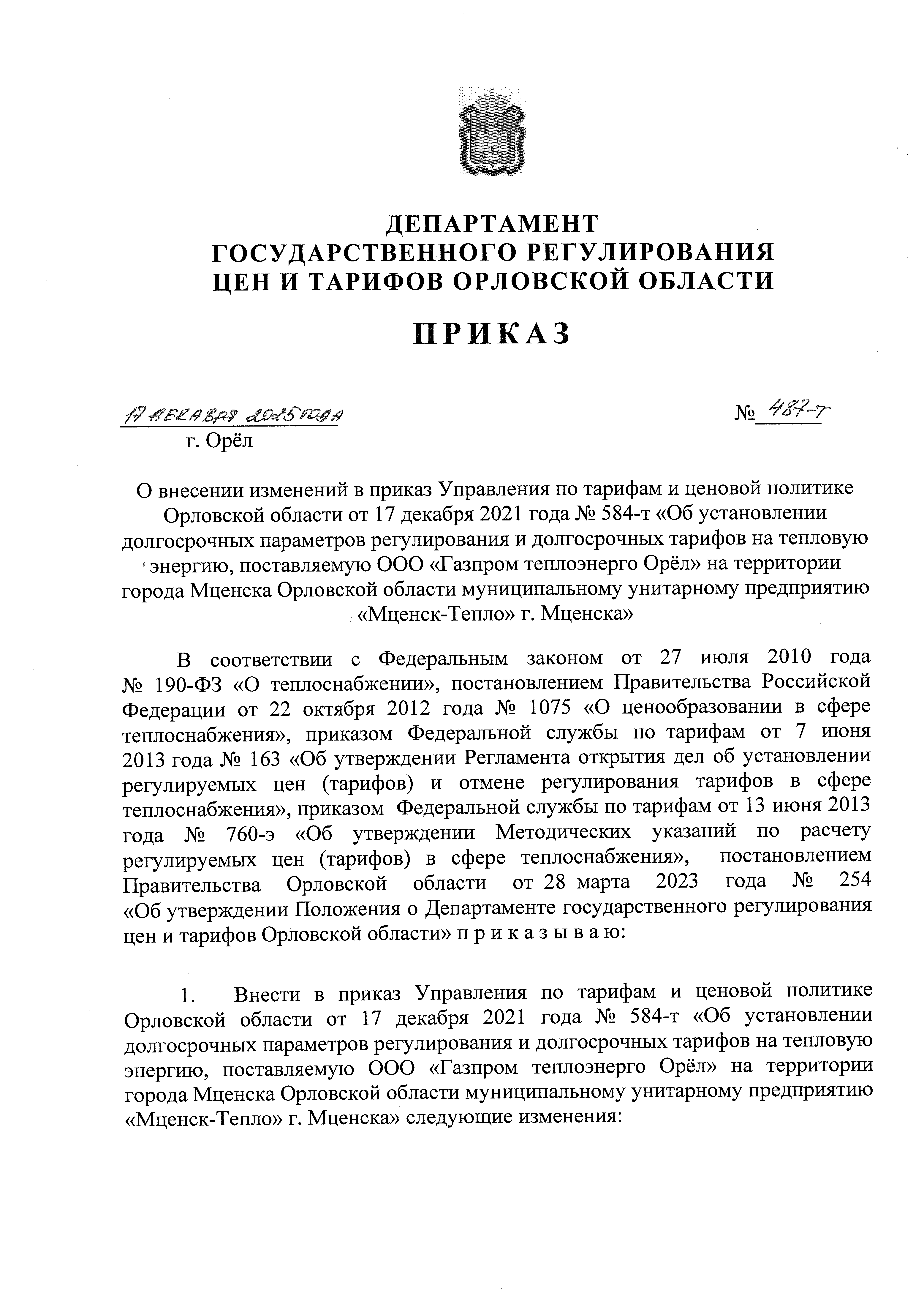 "О внесении изменений в приказ Управления по тарифам и ценовой политике Орловской области от 17 декабря 2021 года № 584-т "Об установлении долгосрочных параметров регулирования и долгосрочных тарифов на тепловую энергию, поставляемую ООО "Газпром теплоэнерго Орёл" на территории города Мценска Орловской области муниципальному унитарному предприятию "Мценск-Тепло" г. Мценска"