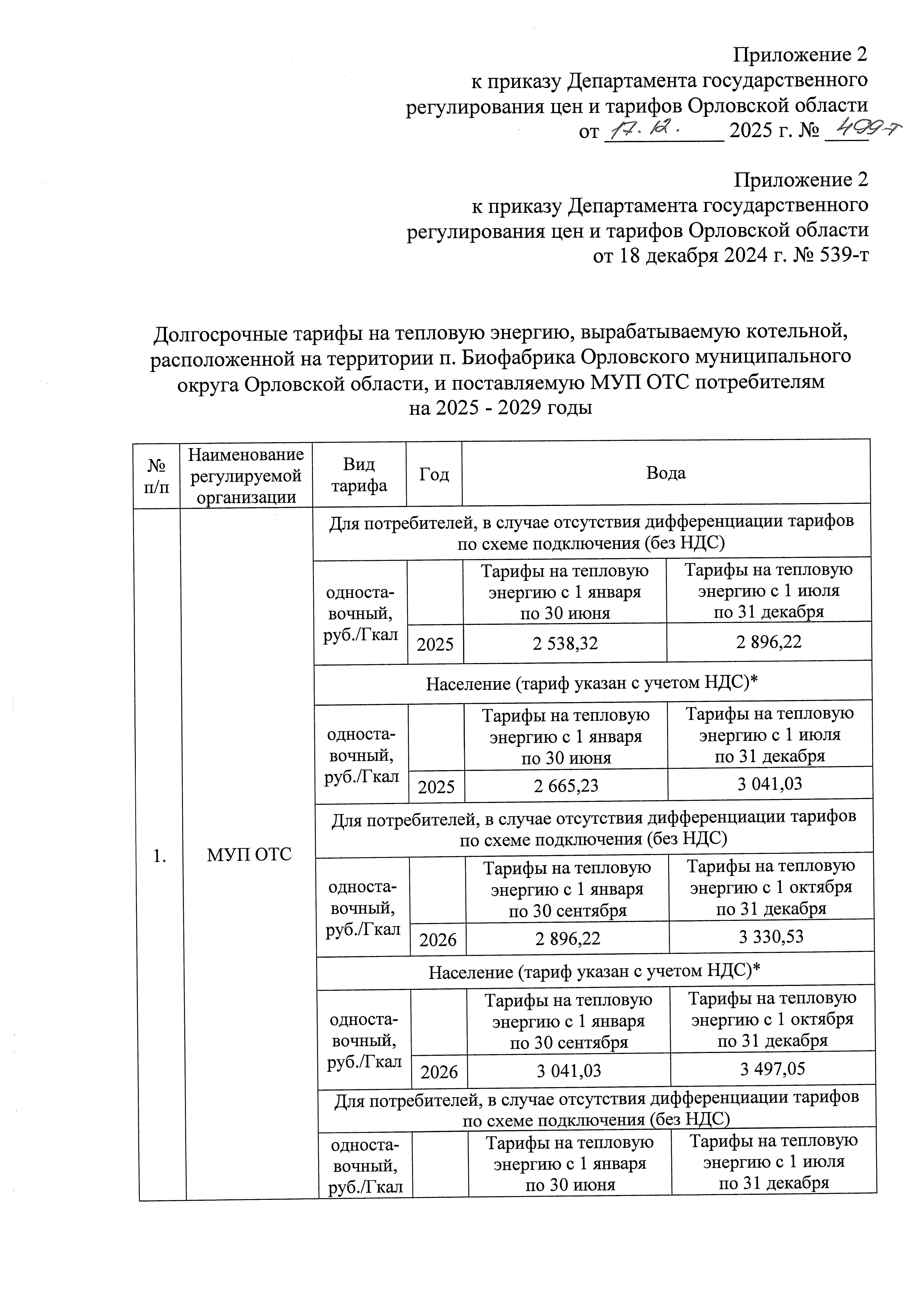 "О внесении изменений в приказ Департамента государственного регулирования цен и тарифов Орловской области от 18 декабря 2024 года № 539-т "Об установлении долгосрочных параметров регулирования и долгосрочных тарифов на тепловую энергию, вырабатываемую котельной, расположенной на территории п. Биофабрика Орловского муниципального округа Орловской области, и поставляемую МУП ОТС потребителям"