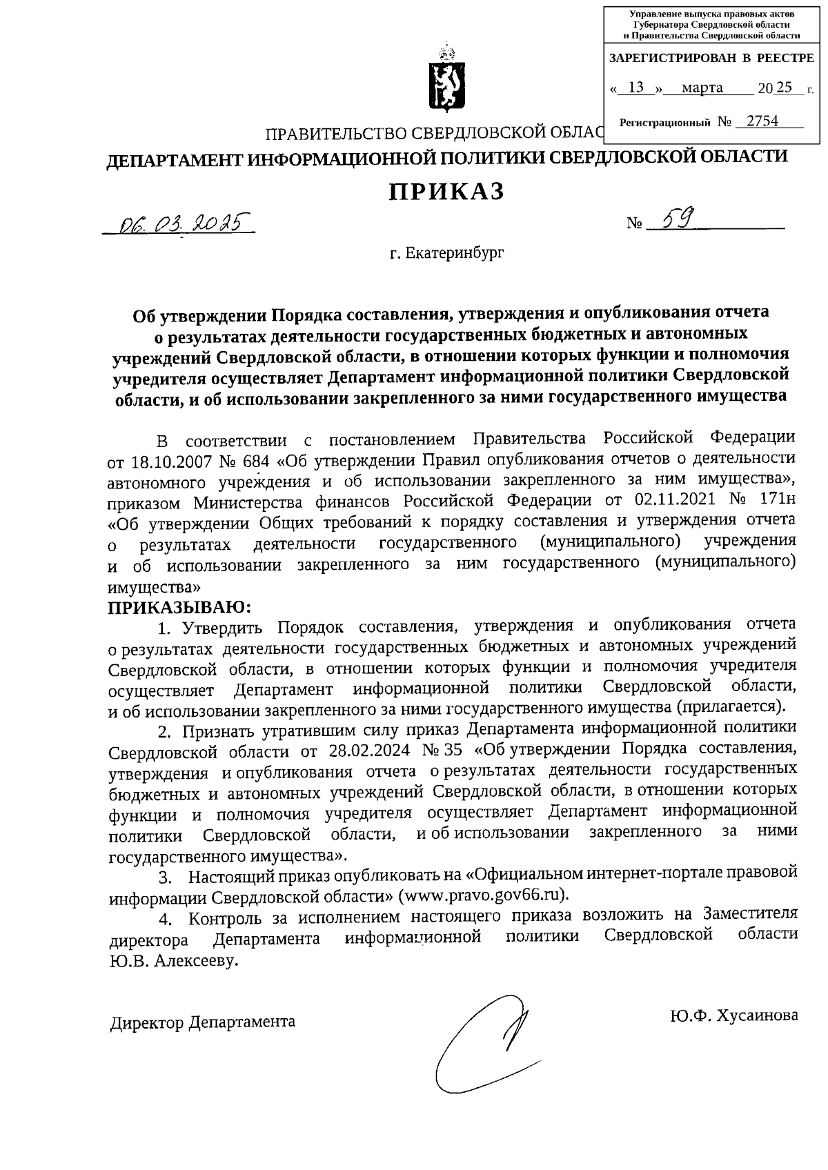 Приказ Департамента информационной политики Свердловской области от 06.03.2025 № 59