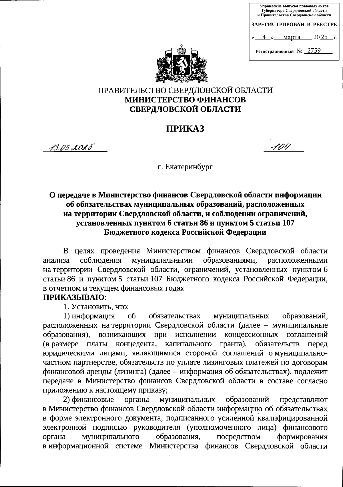 Приказ Министерства финансов Свердловской области от 13.03.2025 № 104