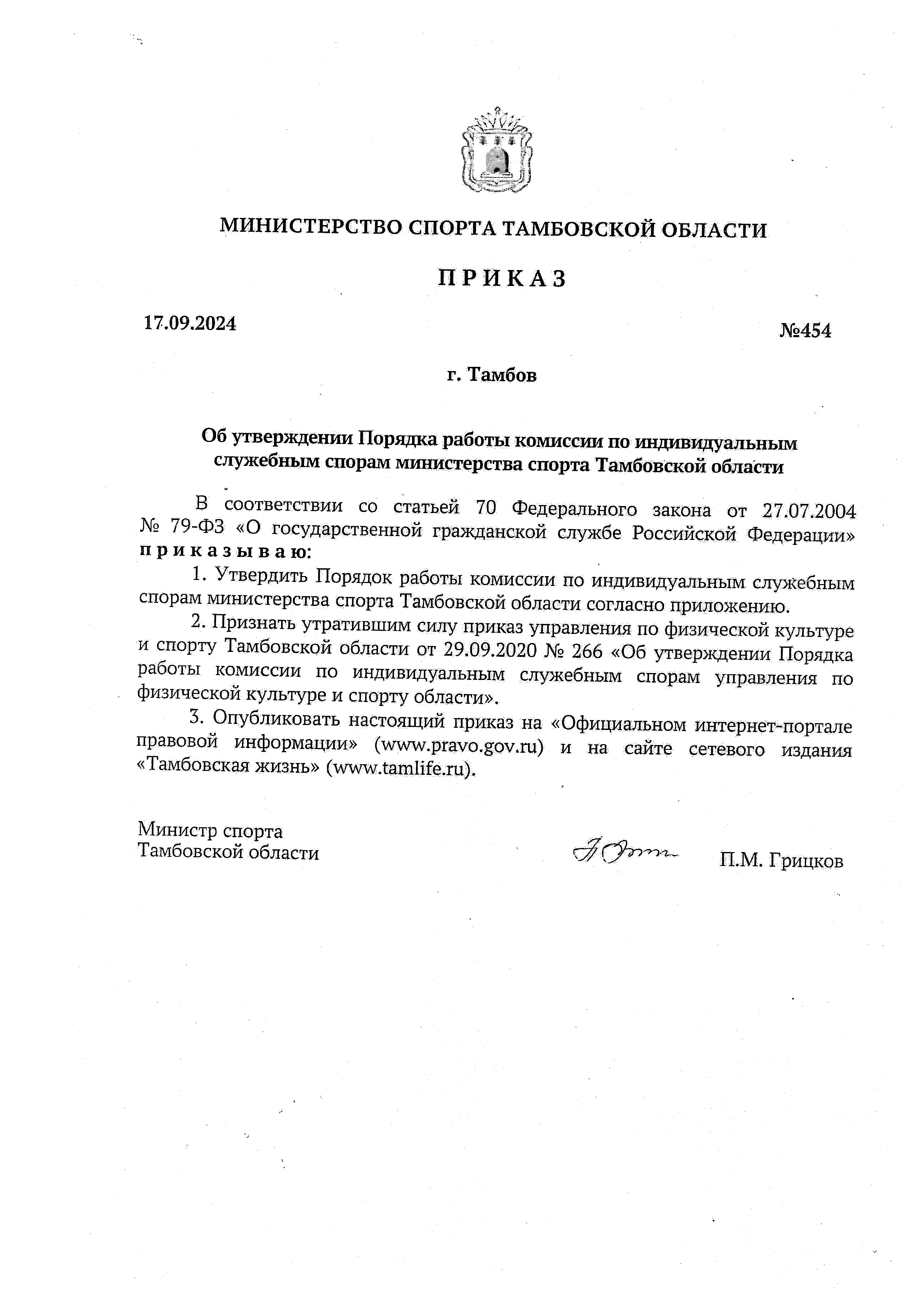 Приказ Министерства спорта Тамбовской области от 17.09.2024 № 454