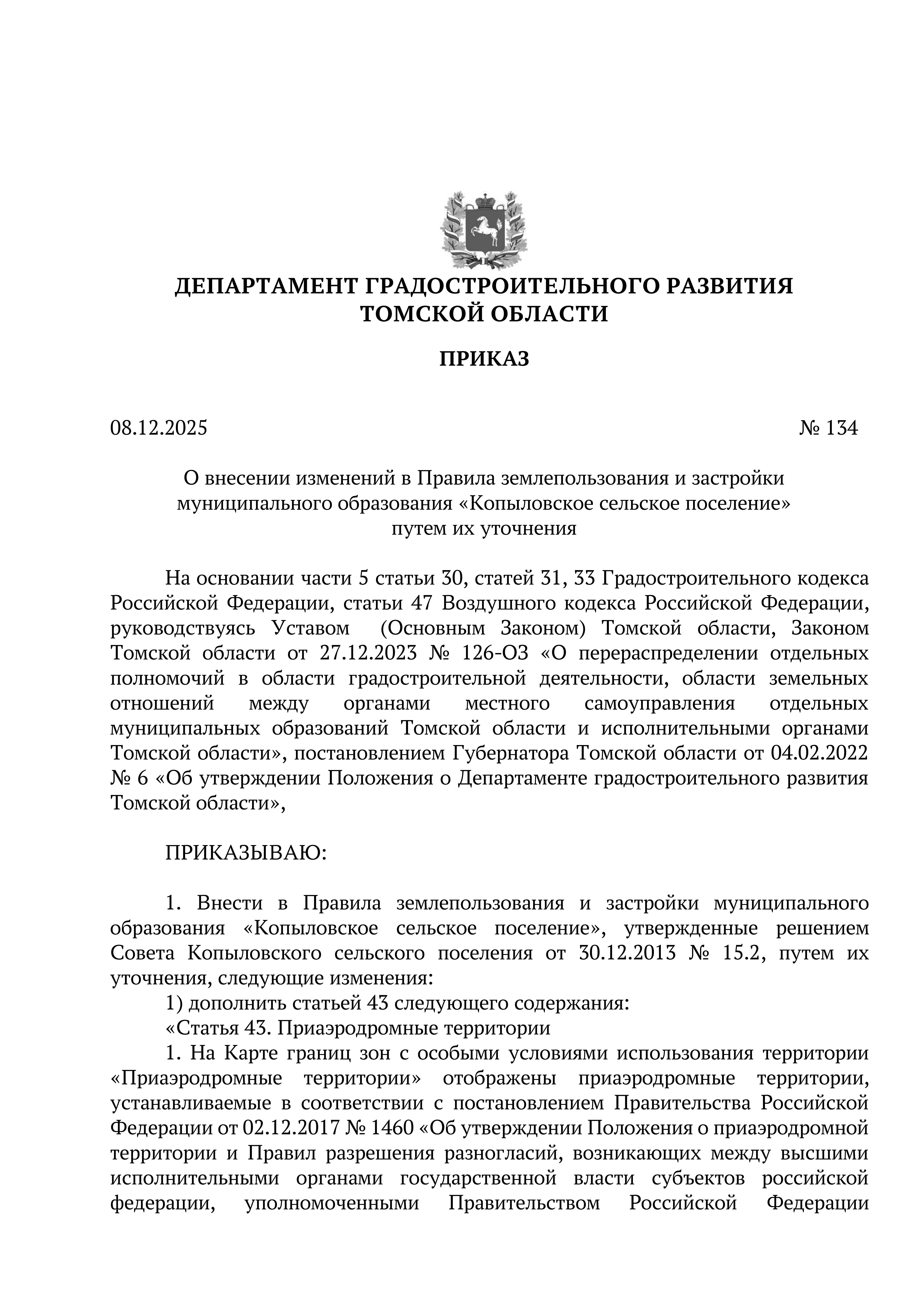 Приказ Департамента градостроительного развития Томской области от 08.12.2025 № 134
