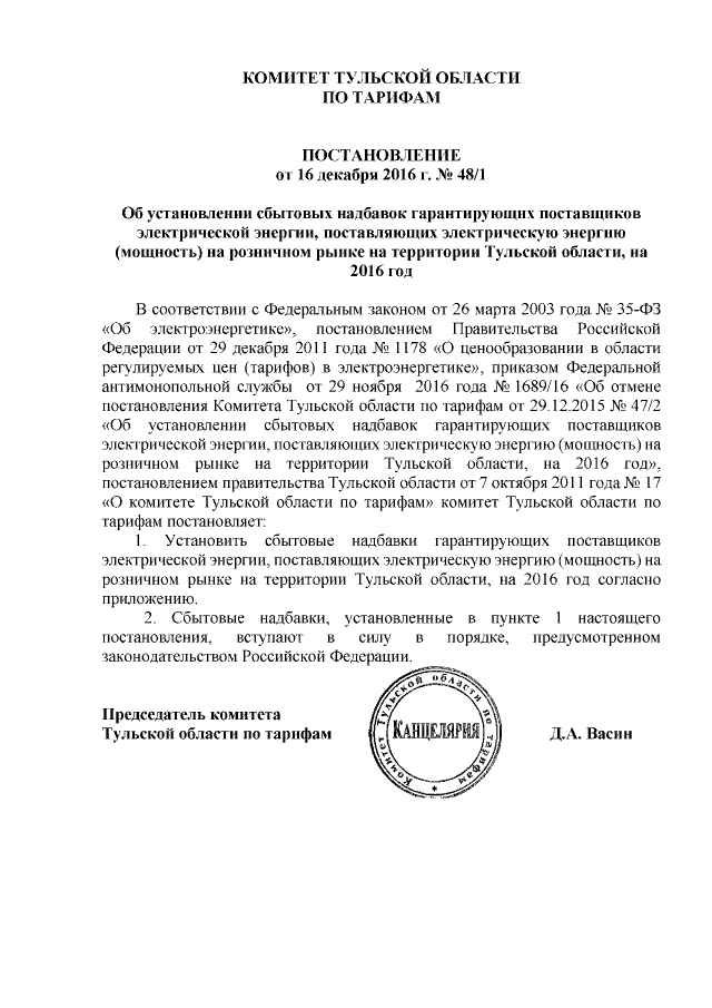Постановление Комитета Тульской области по тарифам от 16.12.2016 № 48/1