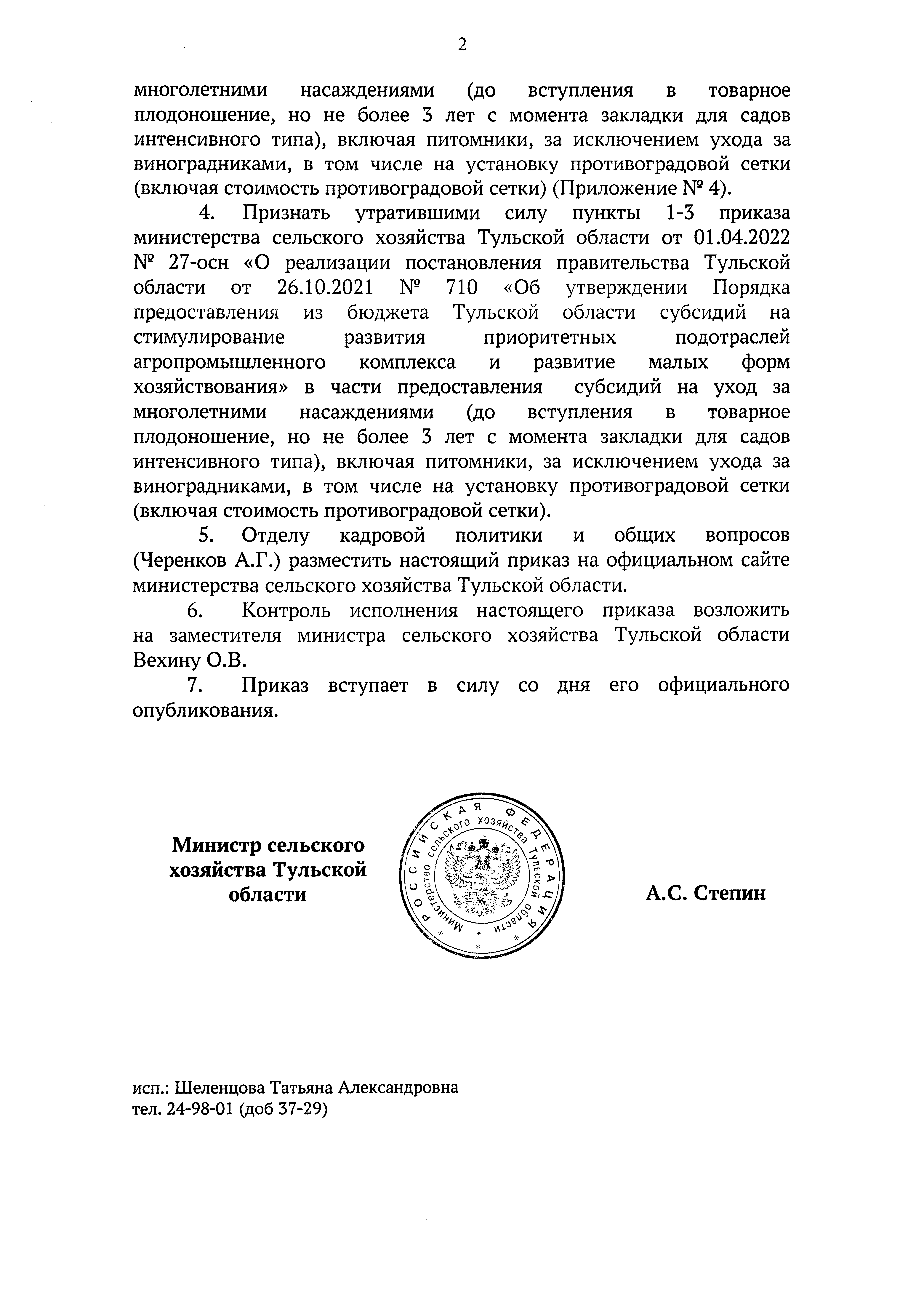 "О реализации постановления правительства Тульской области от 26.10.2021 № 710 "Об утверждении Порядка предоставления из бюджета Тульской области субсидий на стимулирование развития приоритетных подотраслей агропромышленного комплекса и развитие малых форм хозяйствования" в части предоставления субсидий на уход за многолетними насаждениями (до вступления в товарное плодоношение, но не более 3 лет с момента закладки для садов интенсивного типа), включая питомники, за исключением ухода за виноградниками, в том числе на установку противоградовой сетки (включая стоимость противоградовой сетки)"