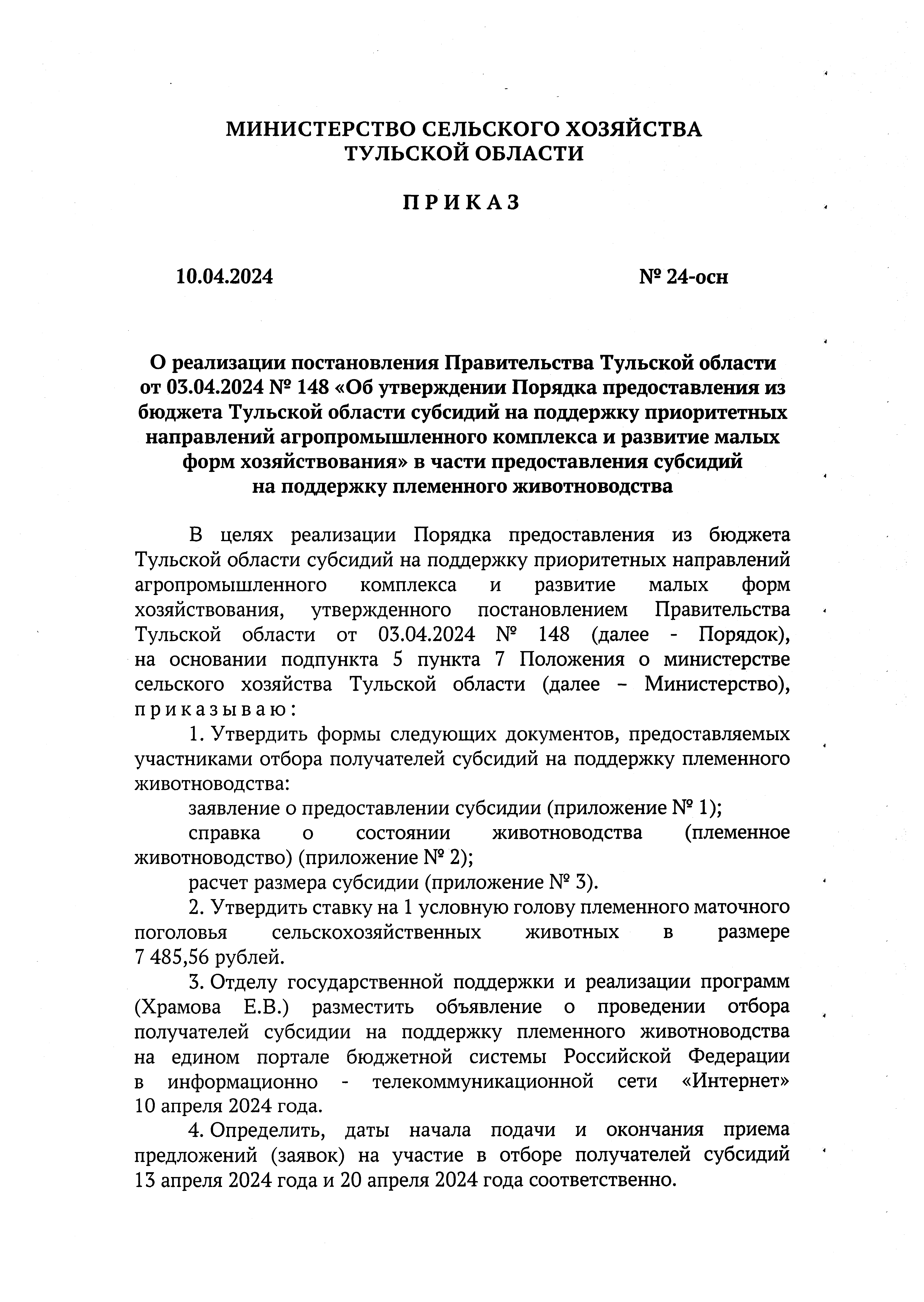 Приказ Министерства сельского хозяйства Тульской области от 10.04.2024 № 24-осн