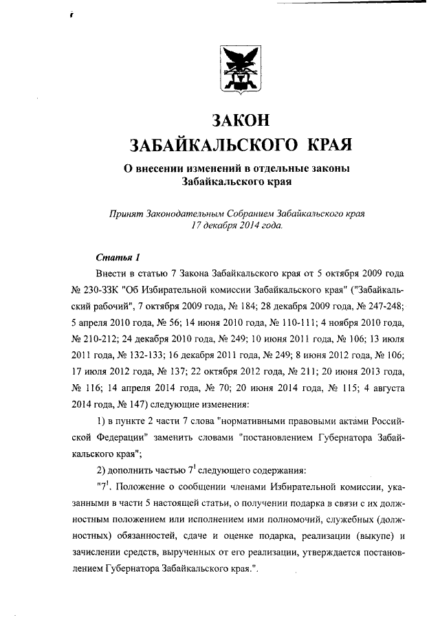 Закон Забайкальского края от 23.12.2014 № 1115-ЗЗК