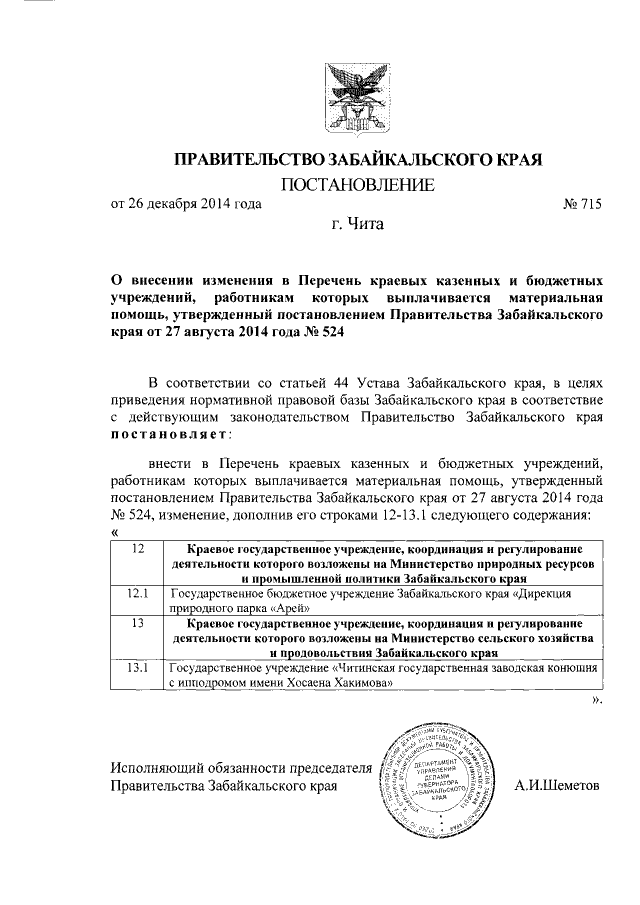 Постановление Правительства Забайкальского края от 26.12.2014 № 715