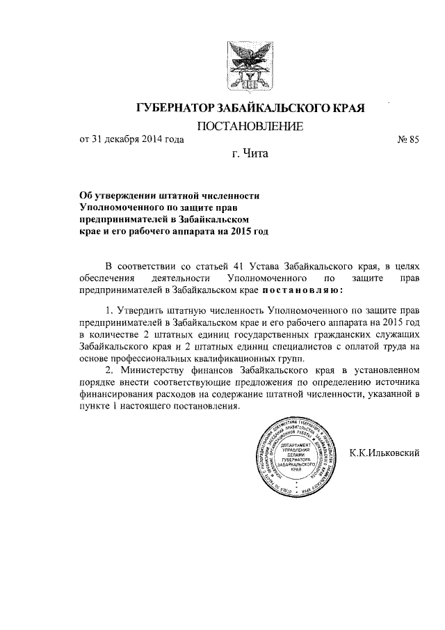 Постановление Губернатора Забайкальского края от 31.12.2014 № 85
