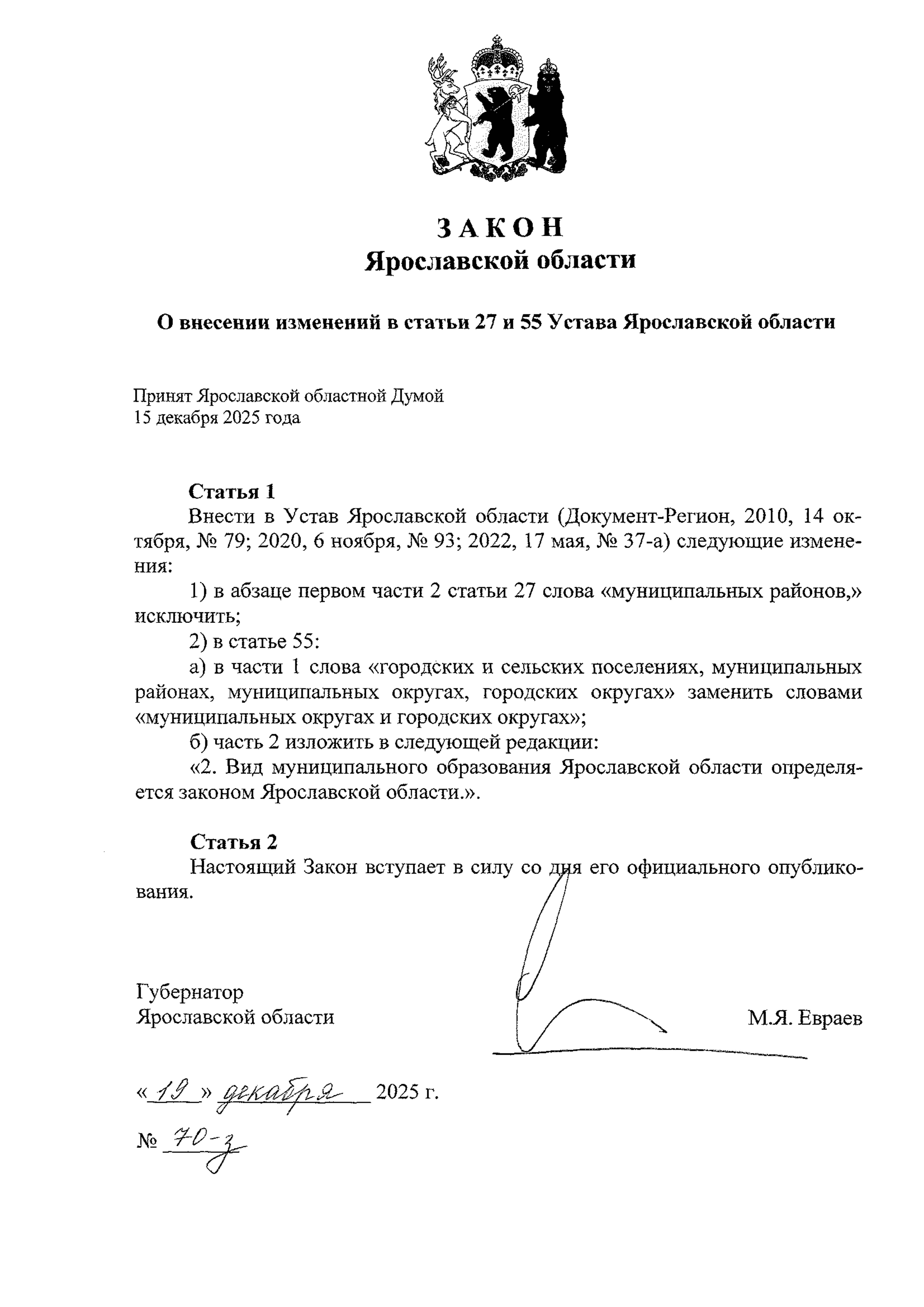 Закон Ярославской области от 19.12.2025 № 70-з