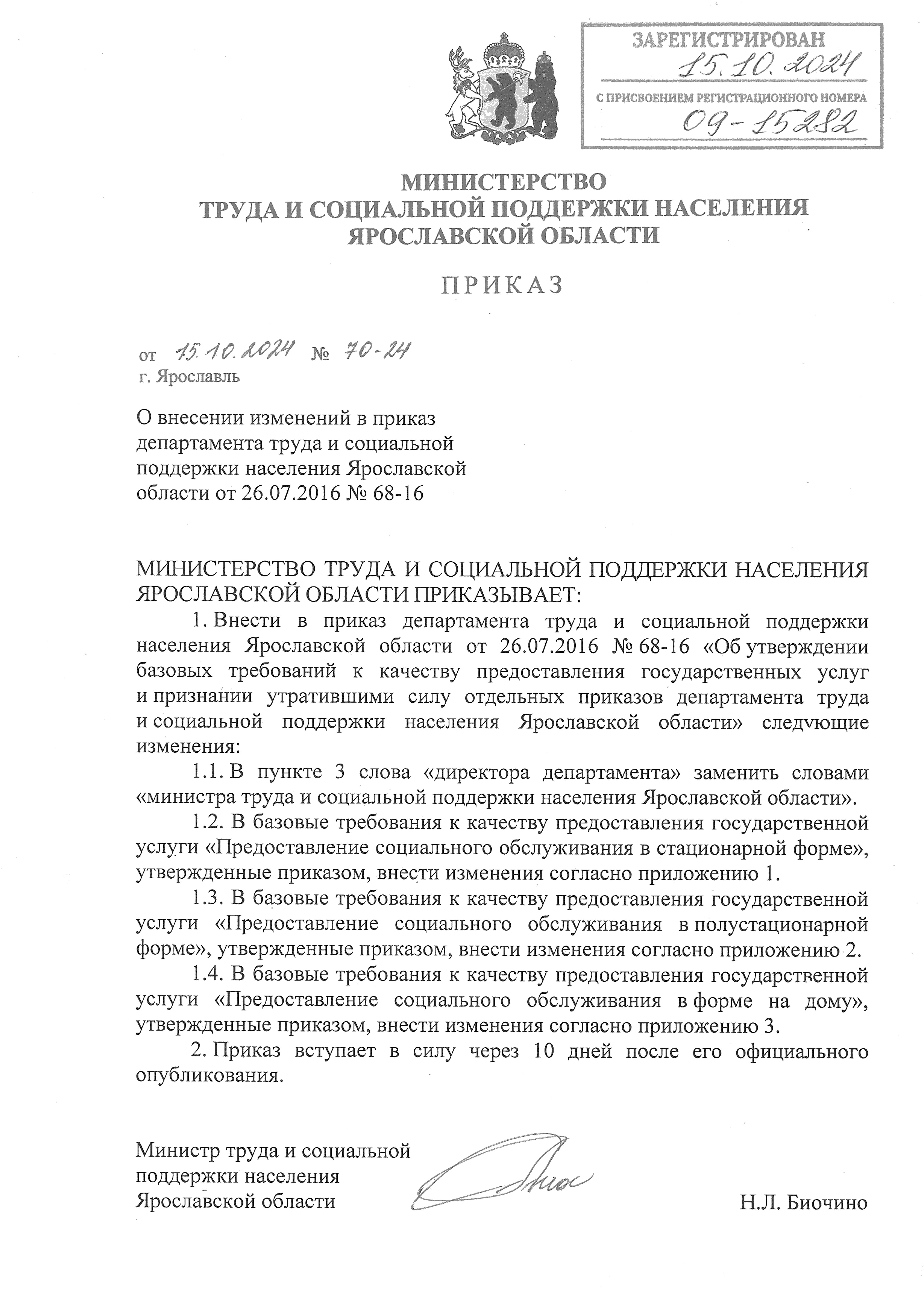 Приказ министерства труда и социальной поддержки населения Ярославской области от 15.10.2024 № 70-24