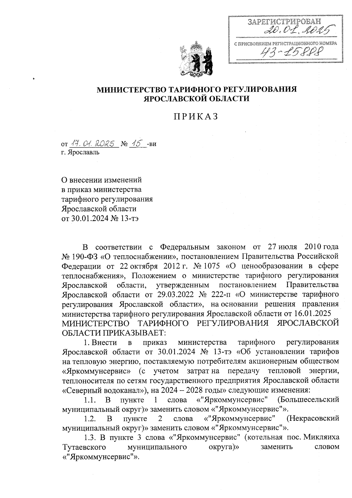 Приказ министерства тарифного регулирования Ярославской области от 17.01.2025 № 15-ви