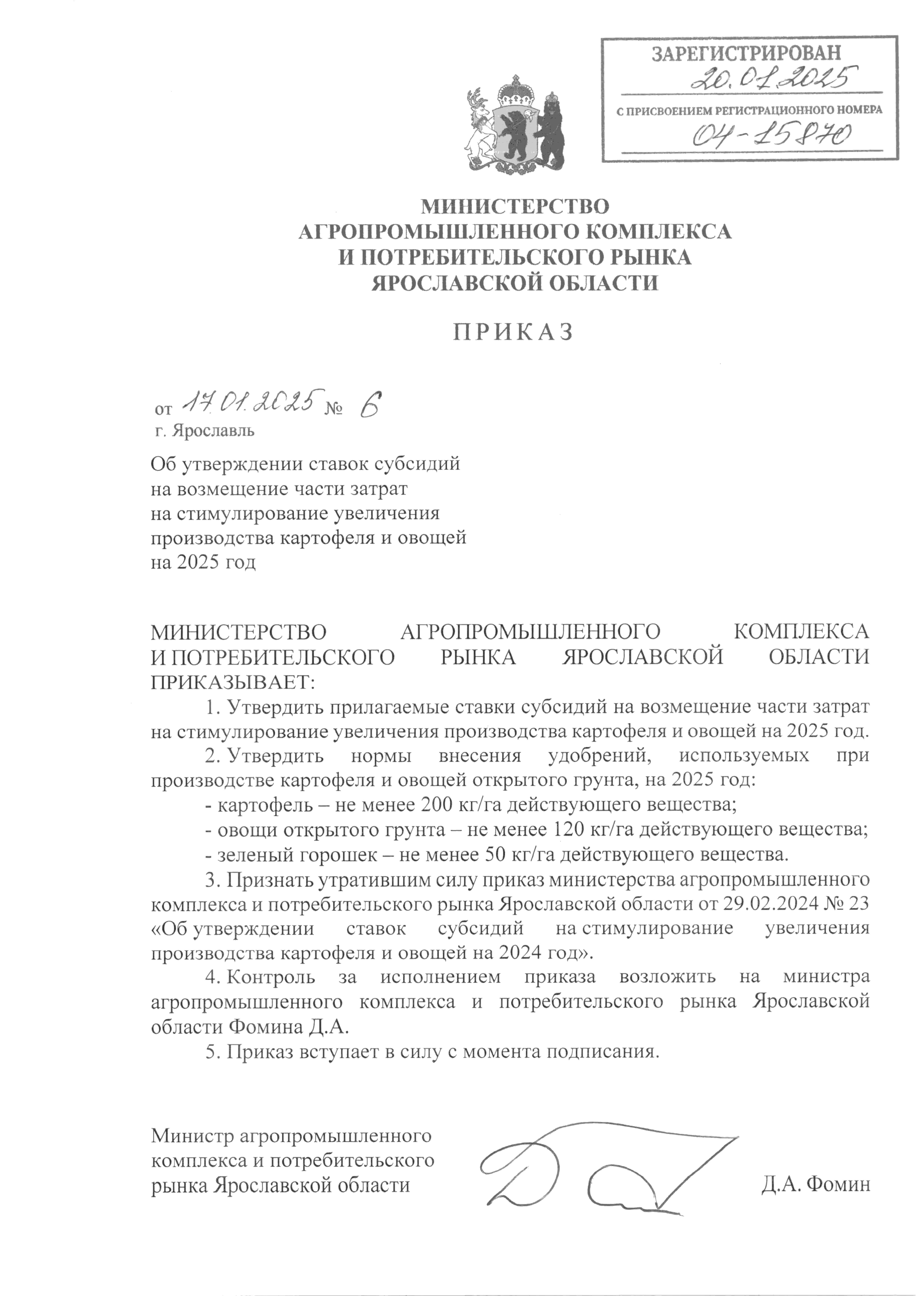 Приказ министерства агропромышленного комплекса и потребительского рынка Ярославской области от 17.01.2025 № 6
