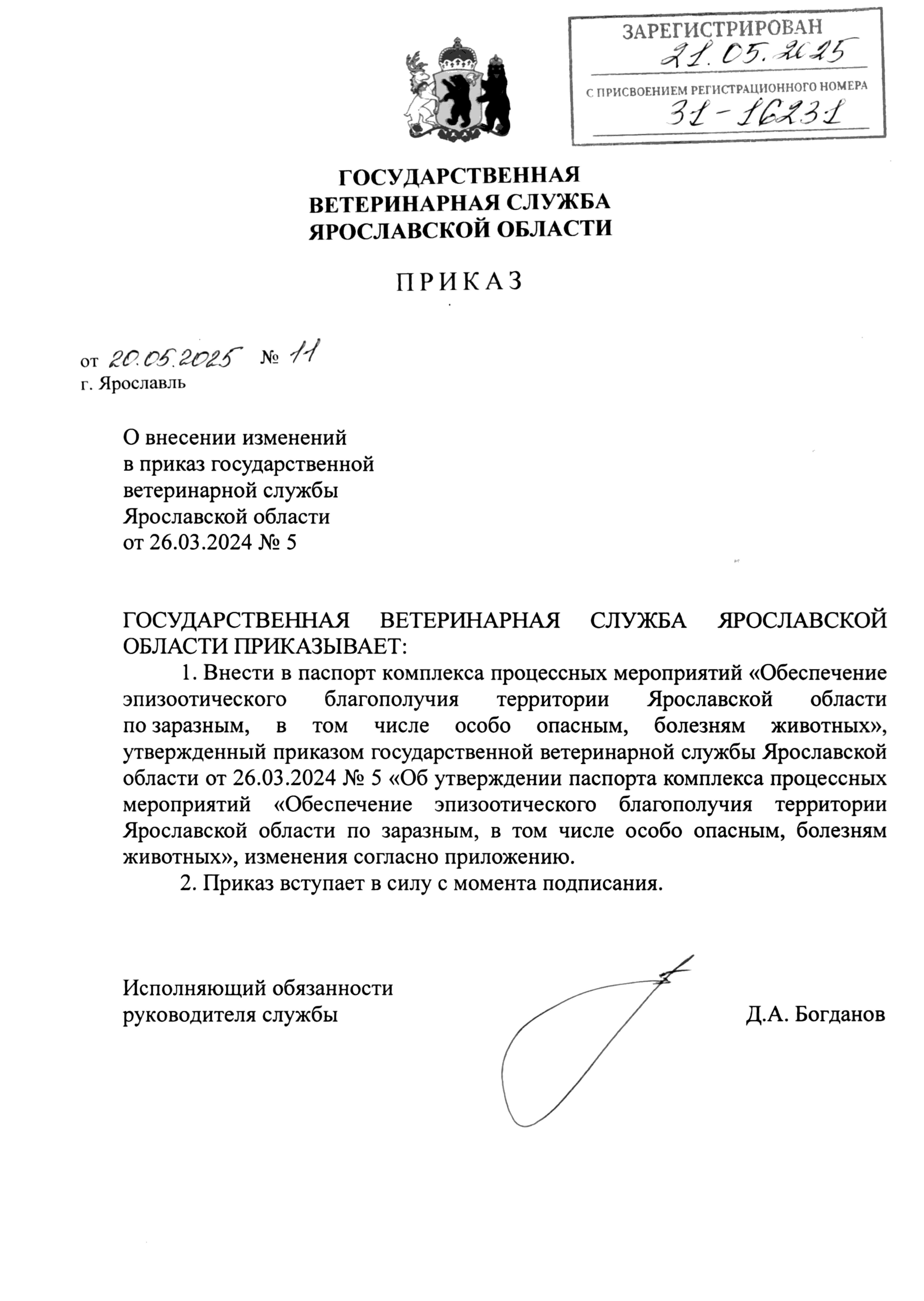 Приказ государственной ветеринарной службы Ярославской области от 20.05.2025 № 11