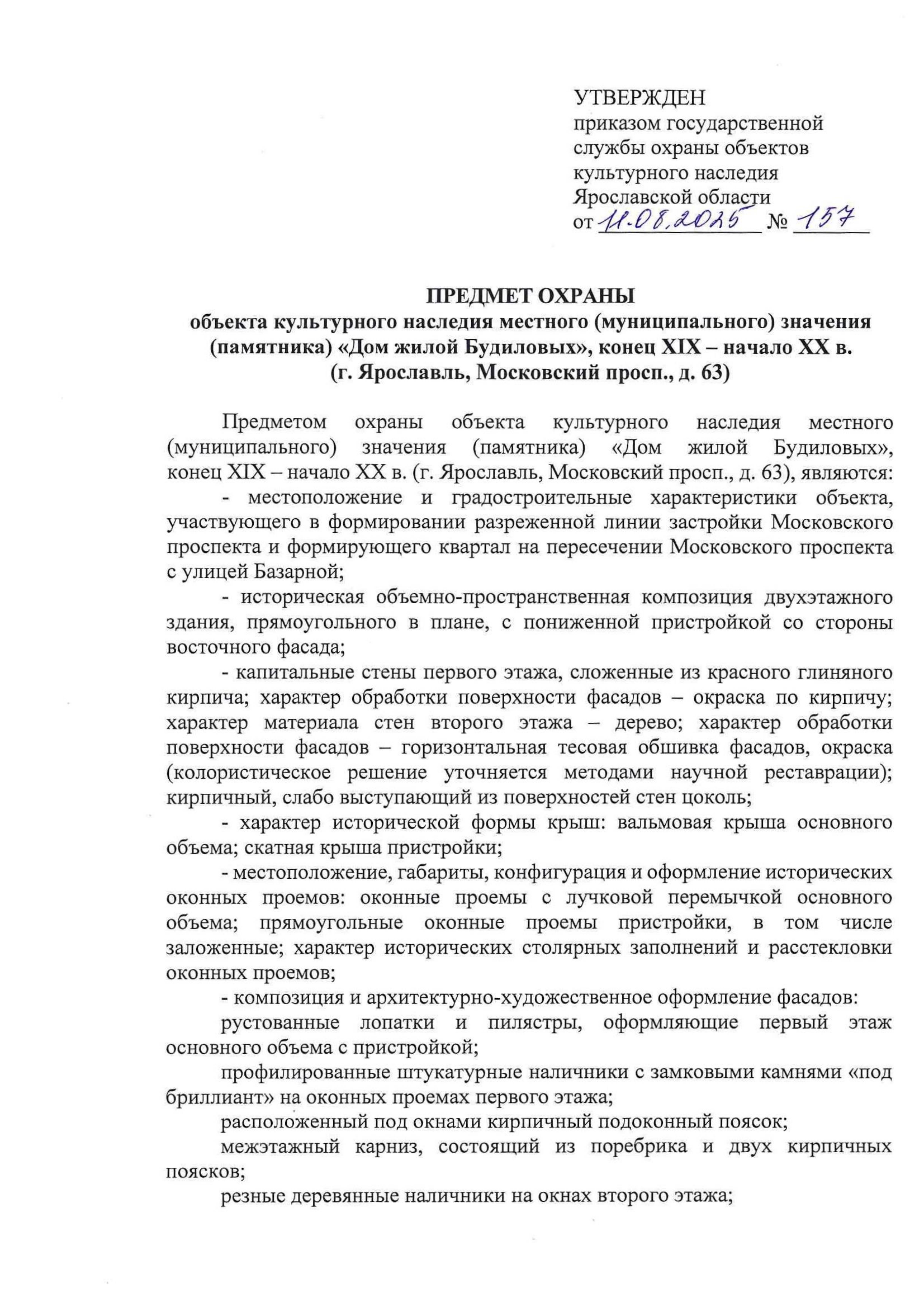Приказ государственной службы охраны объектов культурного наследия Ярославской области от 11.08.2025 № 157