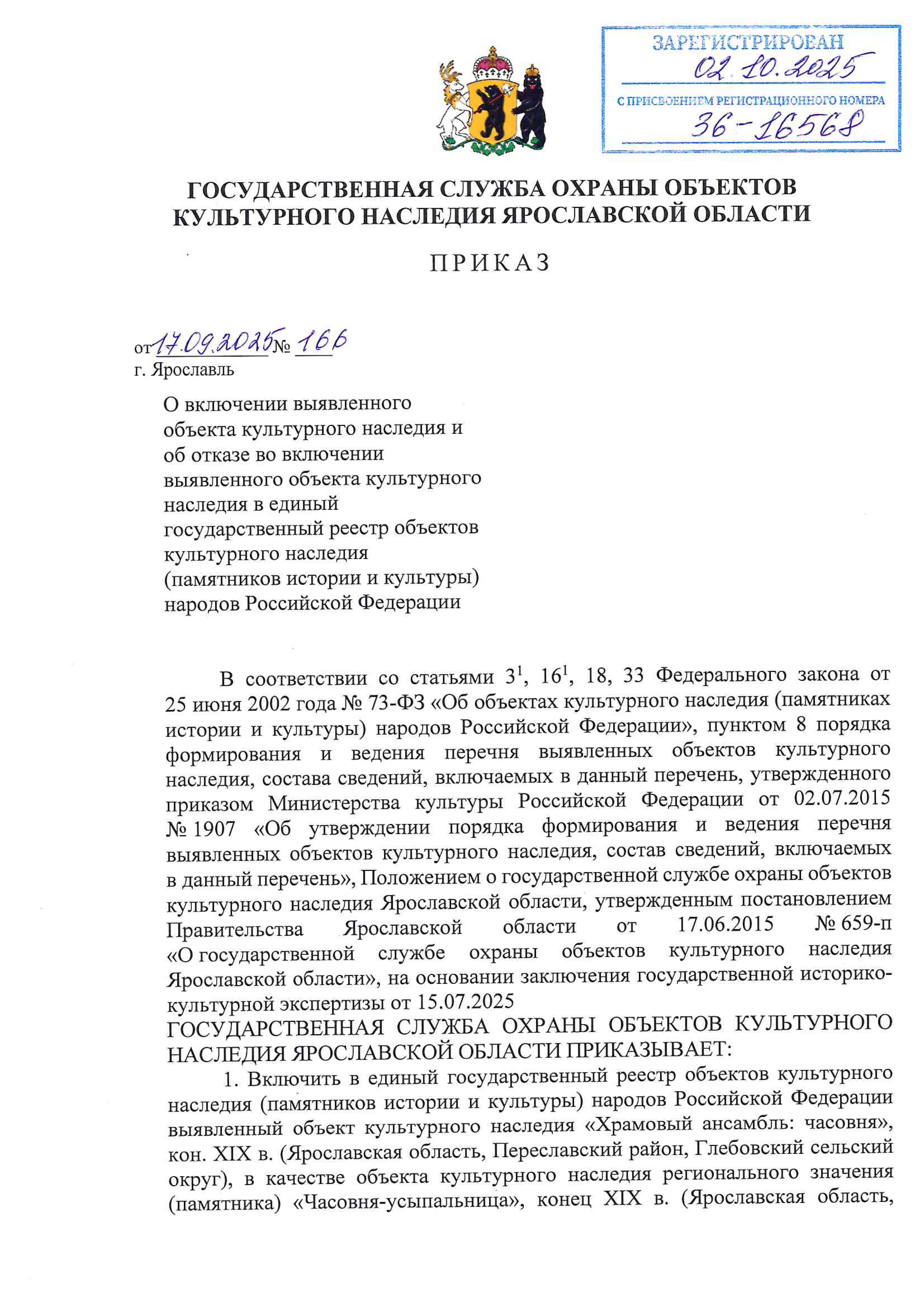 Приказ государственной службы охраны объектов культурного наследия Ярославской области от 17.09.2025 № 166
