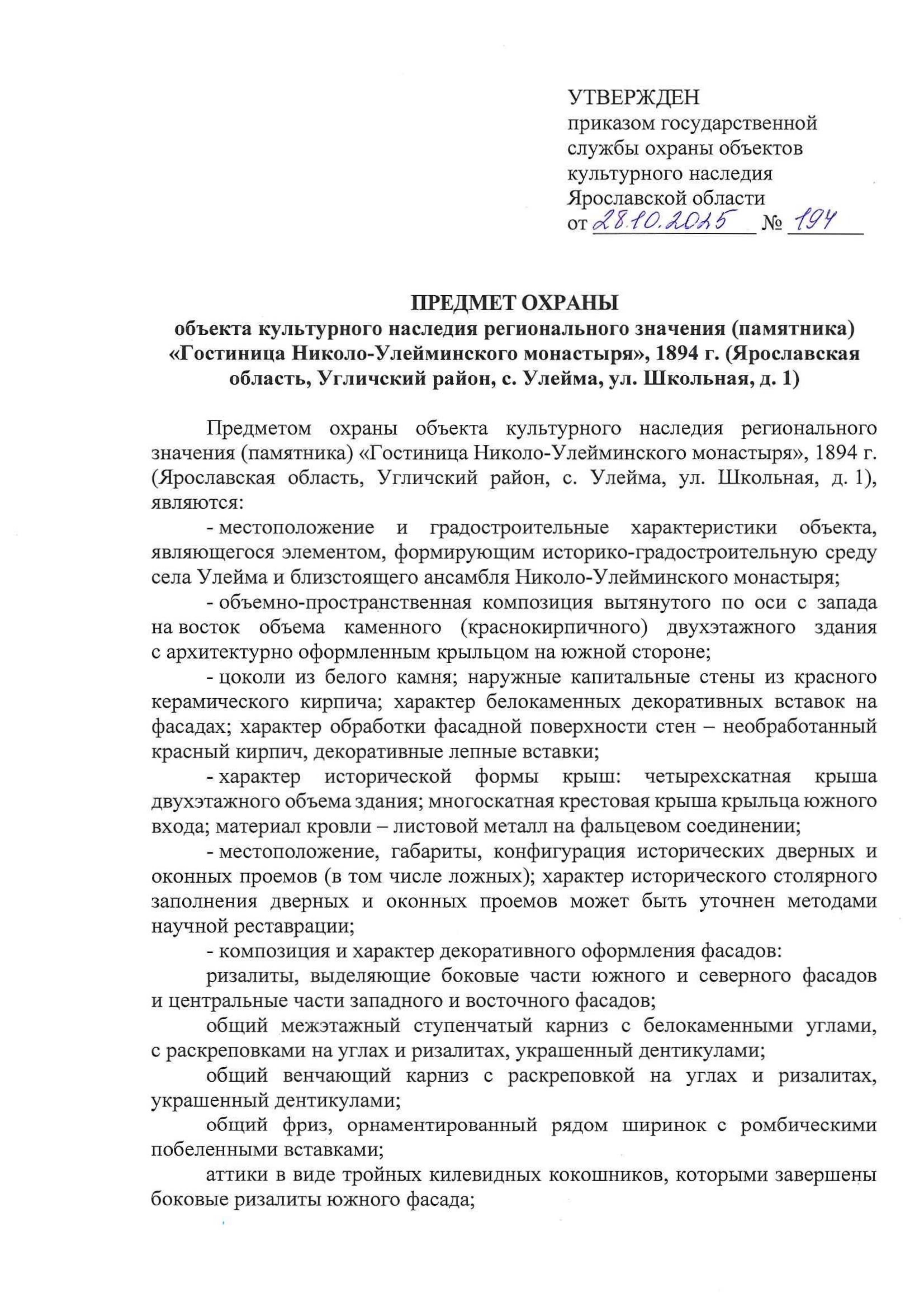 Приказ государственной службы охраны объектов культурного наследия Ярославской области от 28.10.2025 № 194