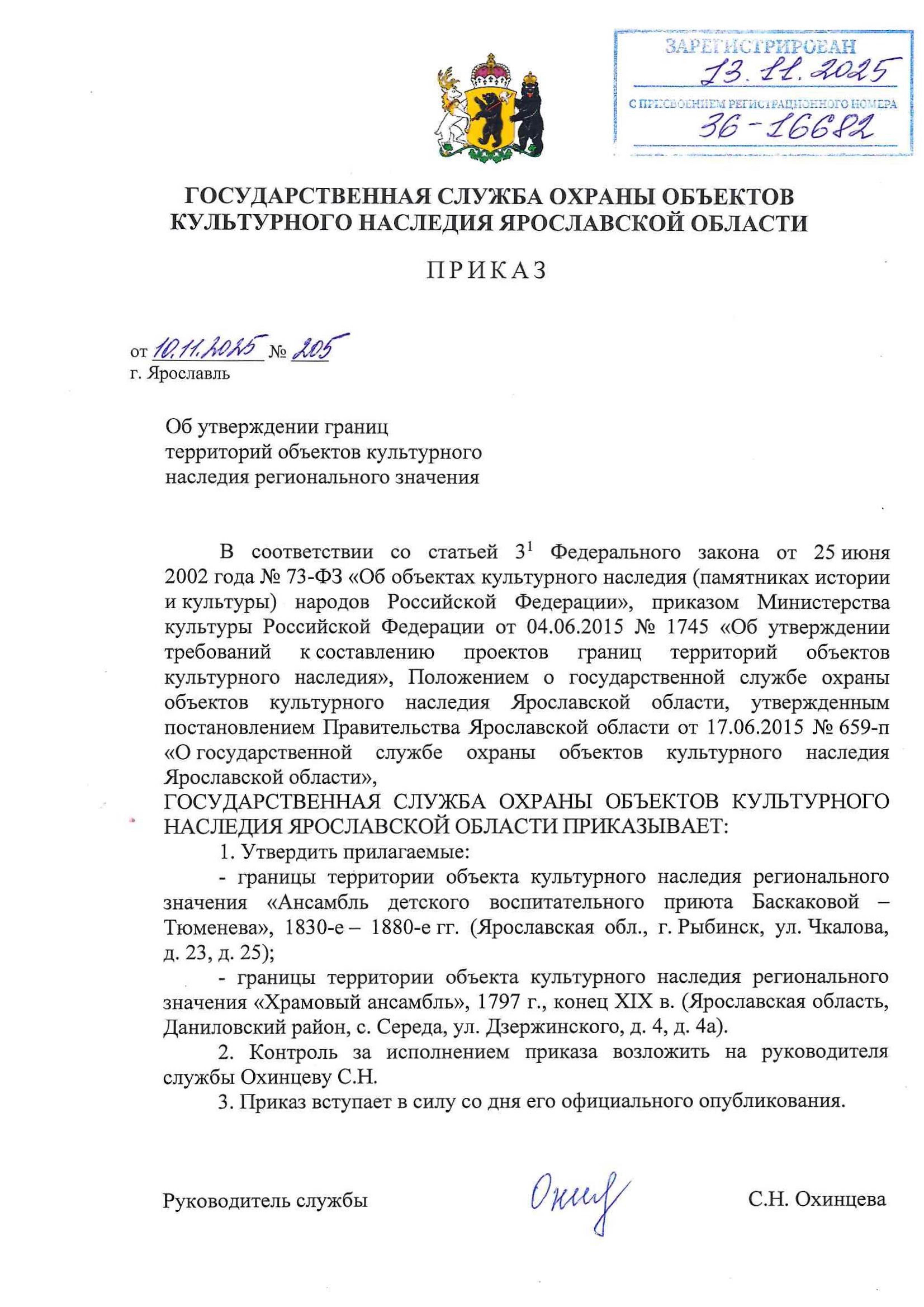 Приказ государственной службы охраны объектов культурного наследия Ярославской области от 10.11.2025 № 205