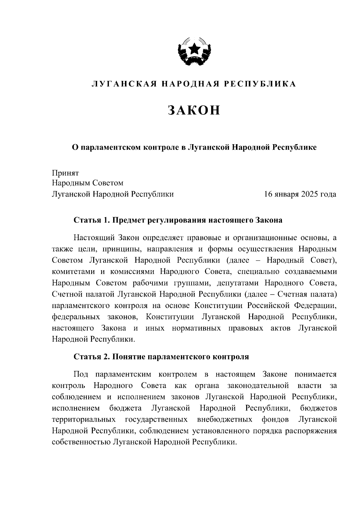 "О парламентском контроле в Луганской Народной Республике"