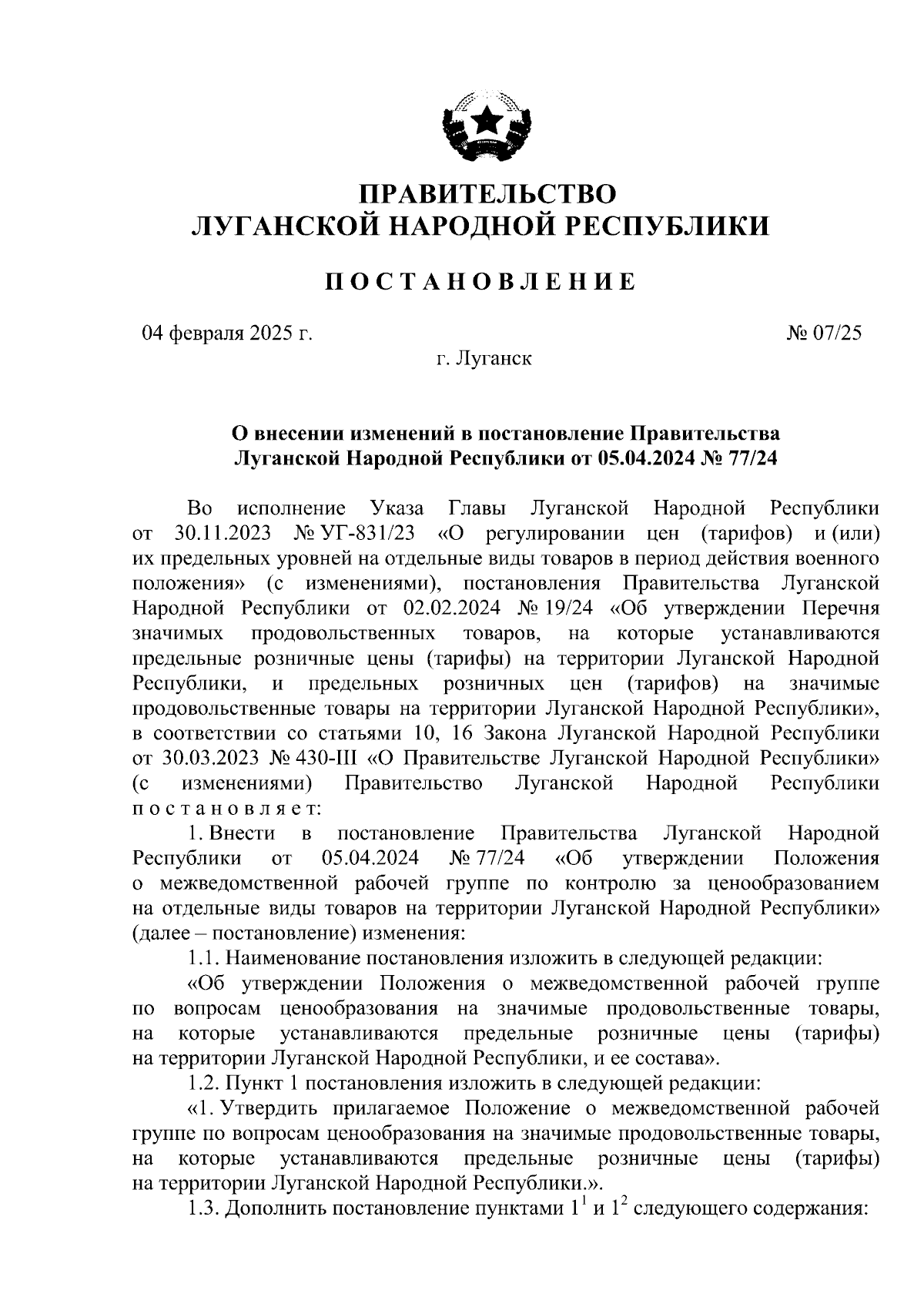 Постановление Правительства Луганской Народной Республики от 04.02.2025 № 07/25