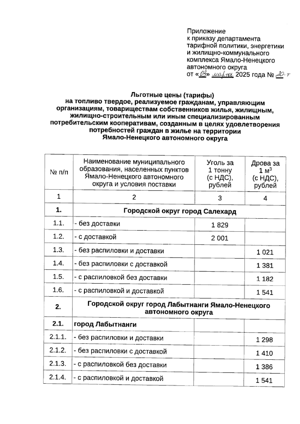 Приказ Департамента тарифной политики, энергетики и жилищно-коммунального комплекса Ямало-Ненецкого автономного округа от 03.03.2025 № 20-т