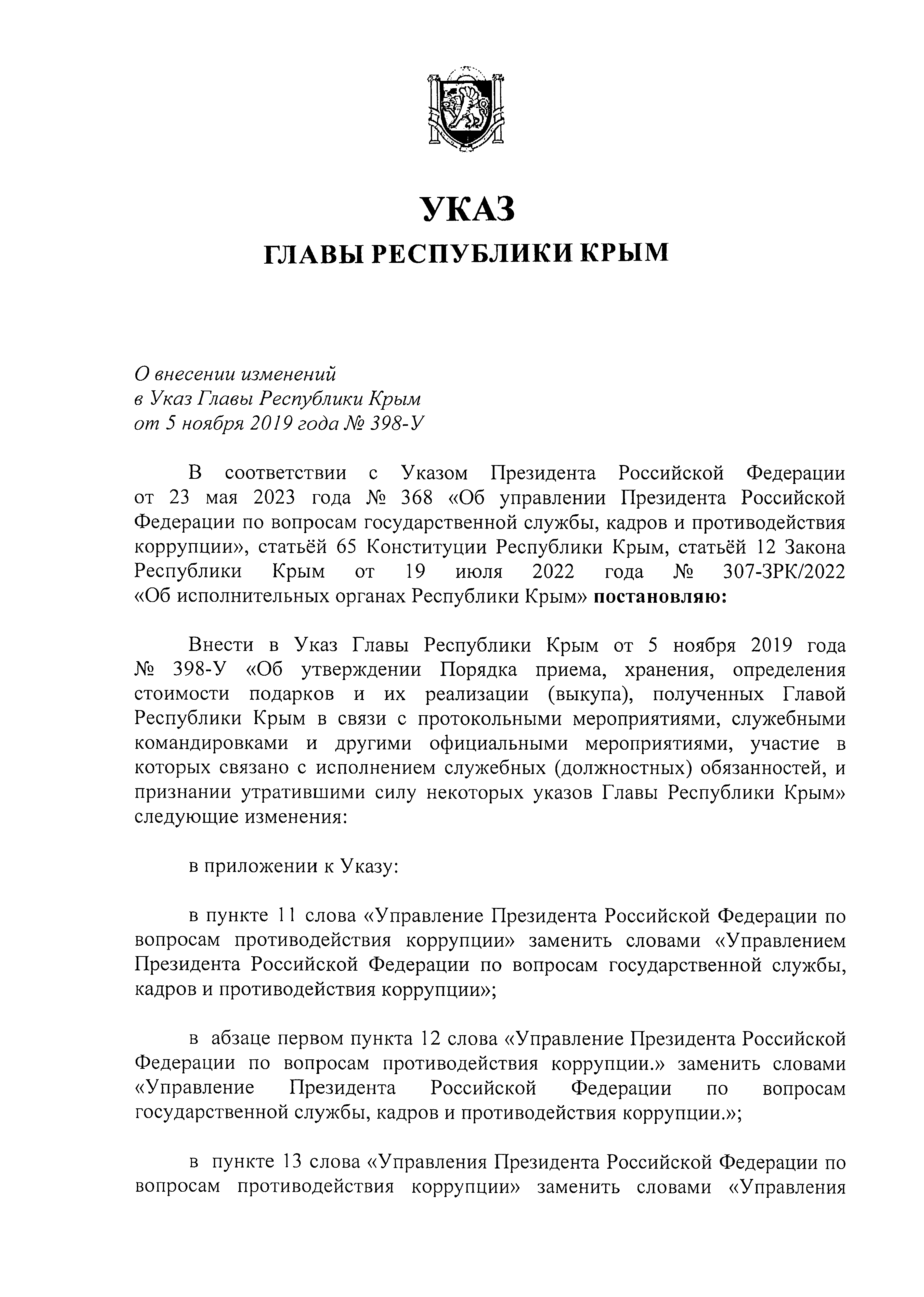 "О внесении изменений в Указ Главы Республики Крым от 5 ноября 2019 года № 398-У"