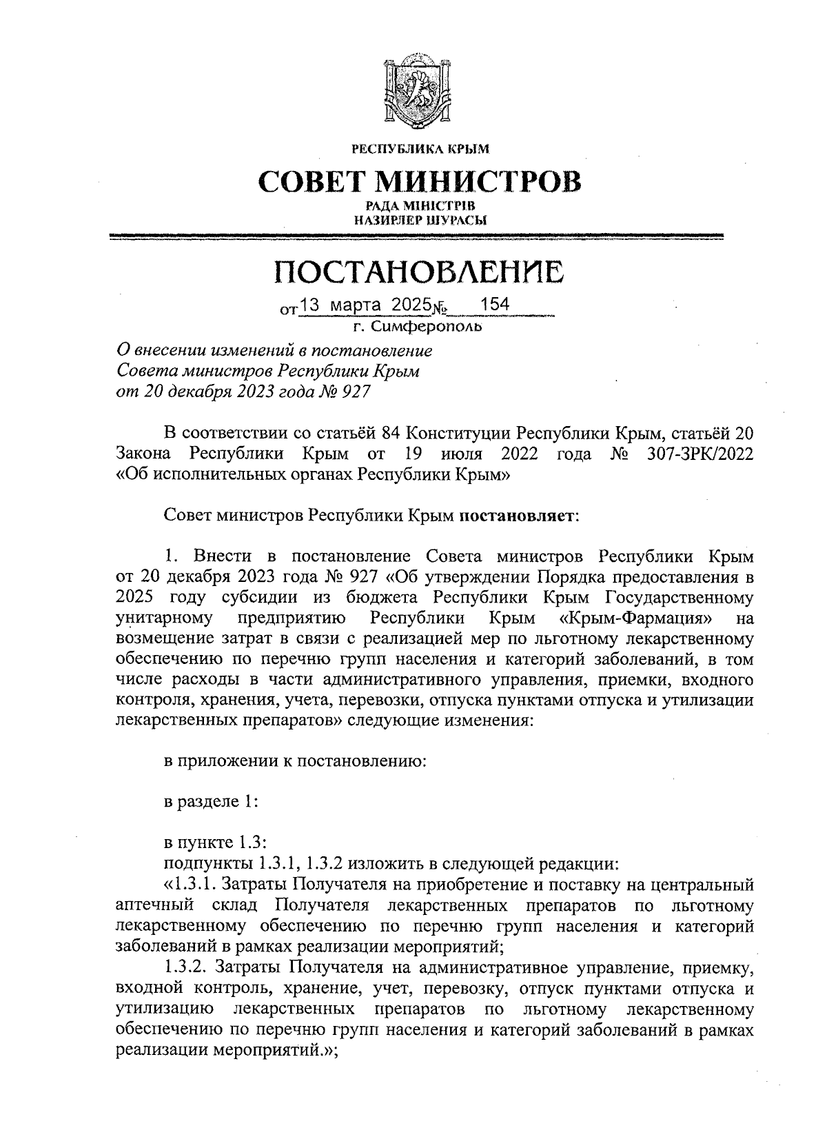 Постановление Совета министров Республики Крым от 13.03.2025 № 154