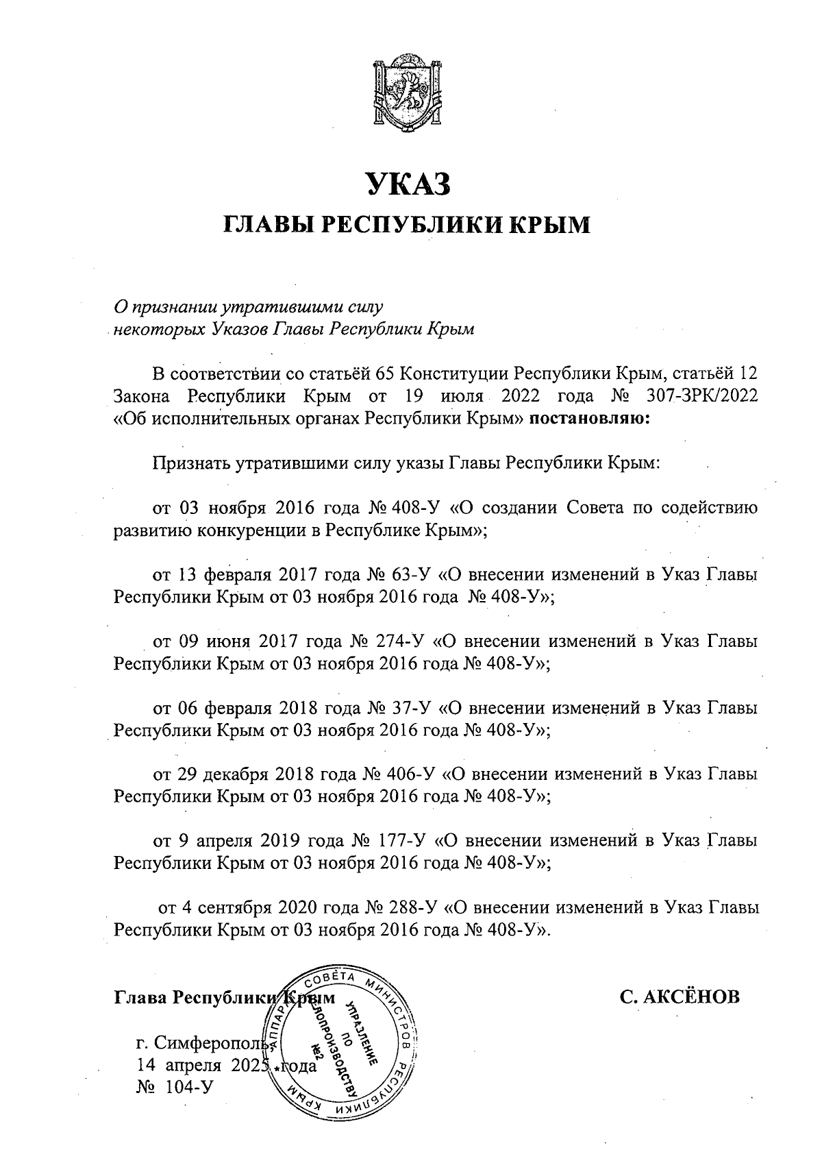Указ Главы Республики Крым от 14.04.2025 № 104-У